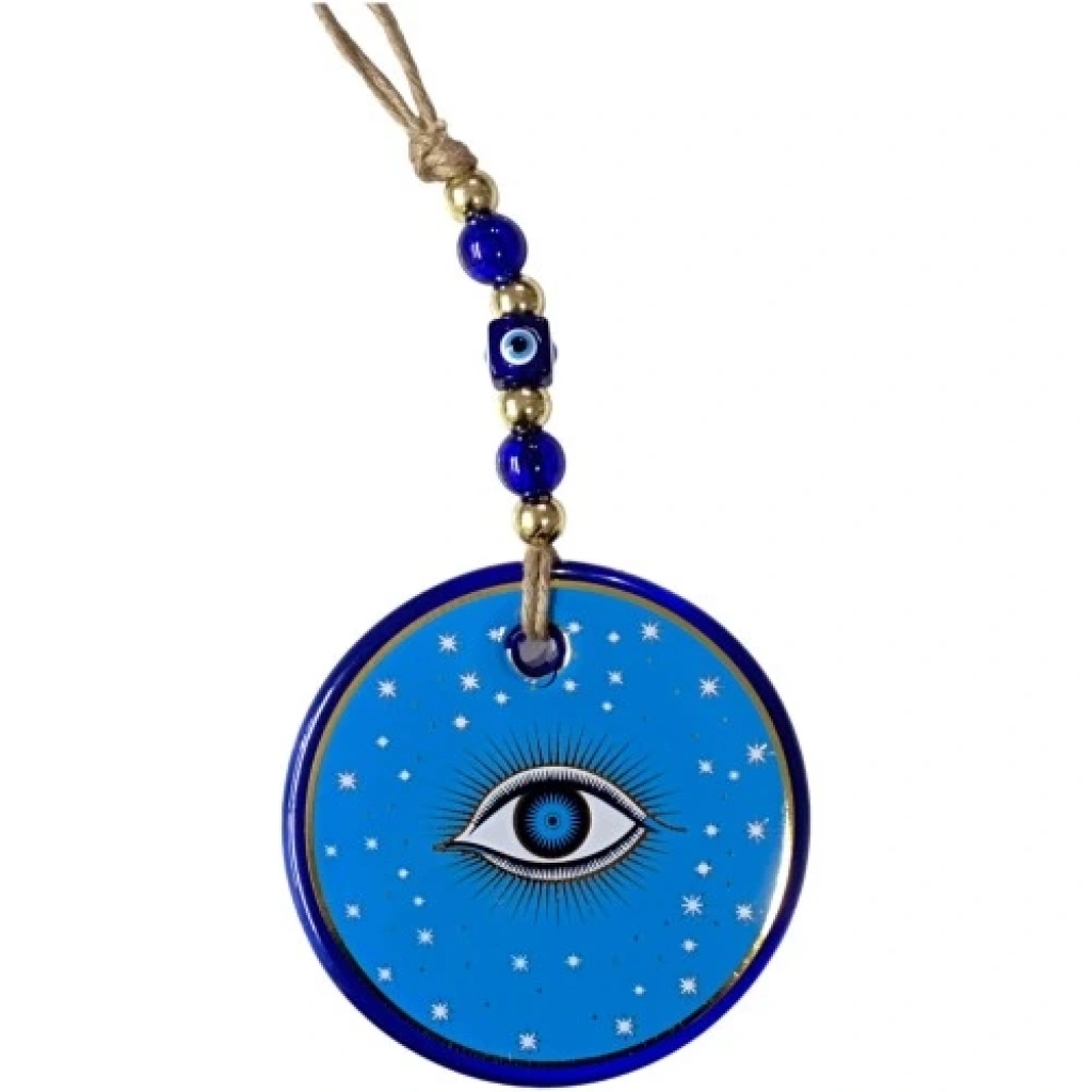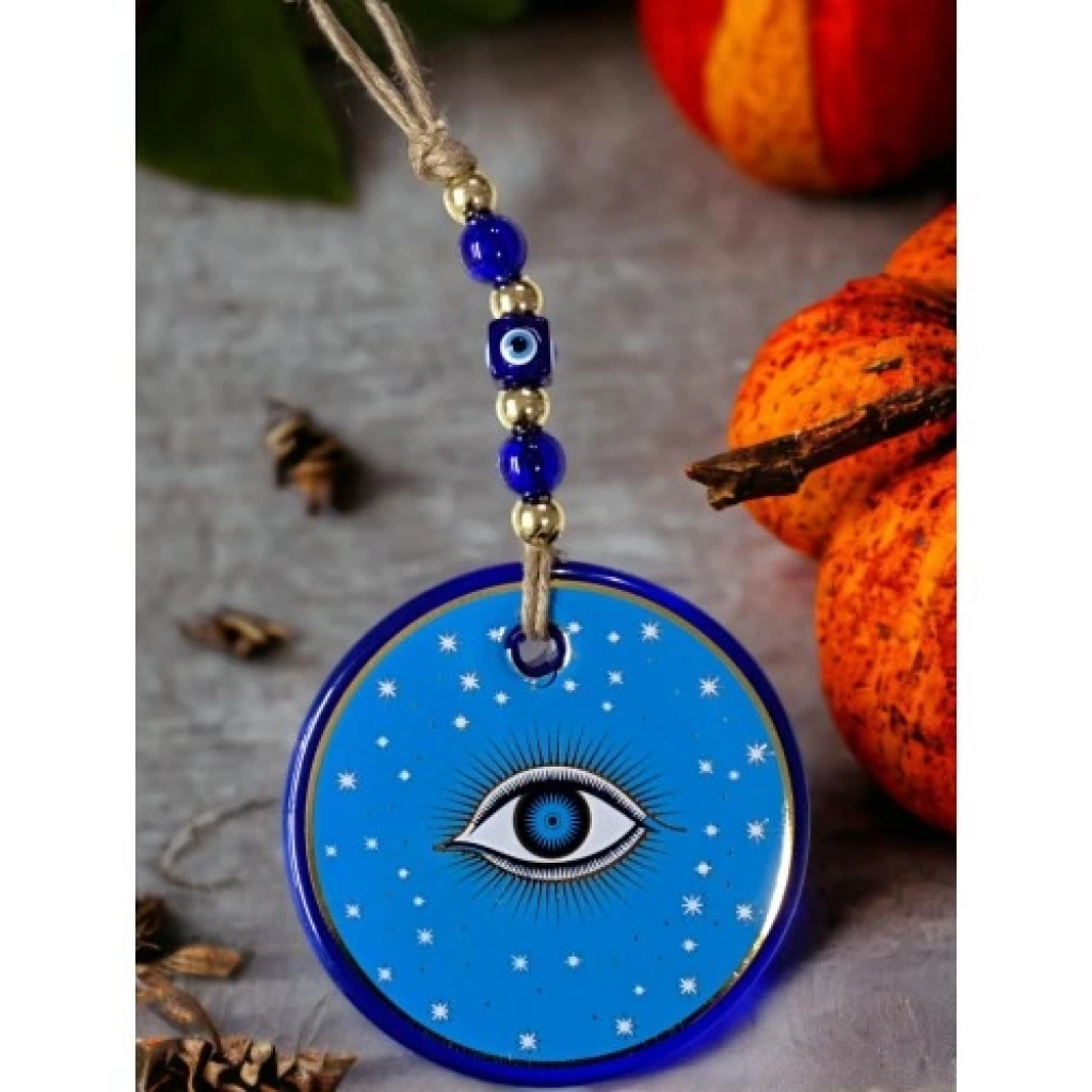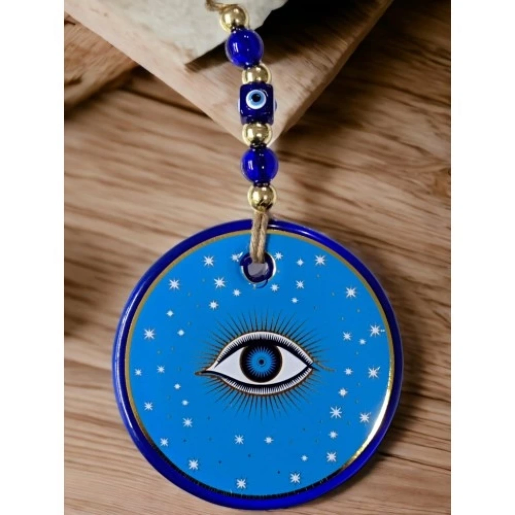 Mavi renk yıldız motifli göz süsümüz nazar boncuğu ile süslenmiştir. Ürünümüz mavi cam nazar boncuğundan tamamen el işçiliği ile üretilmiştir. Ürünümüzün yuvarlak kısmı 13 santimetre çapındadır. Duvar süsümüz ip dahil yaklaşık 30 santimetre boyundadır. El yapımı füzyon camdan üretilen açık mavi yıldızlı göz model duvar süsümüz, minimalist ve şık tasarımıyla dikkat çekiyor. Duvarınıza asarak evinizde ferah ve aydınlık bir atmosfer yaratabilirsiniz.