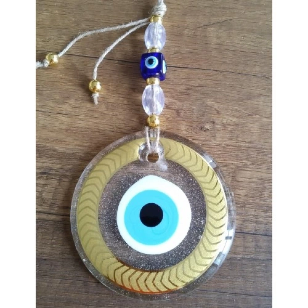 Şeffaf cam duvar süsümüzün yuvarlak kısmı 11 santimetre çapındadır. Nazar boncuklu duvar süsümüz ip dahil yaklaşık 25 santimetre boyundadır.