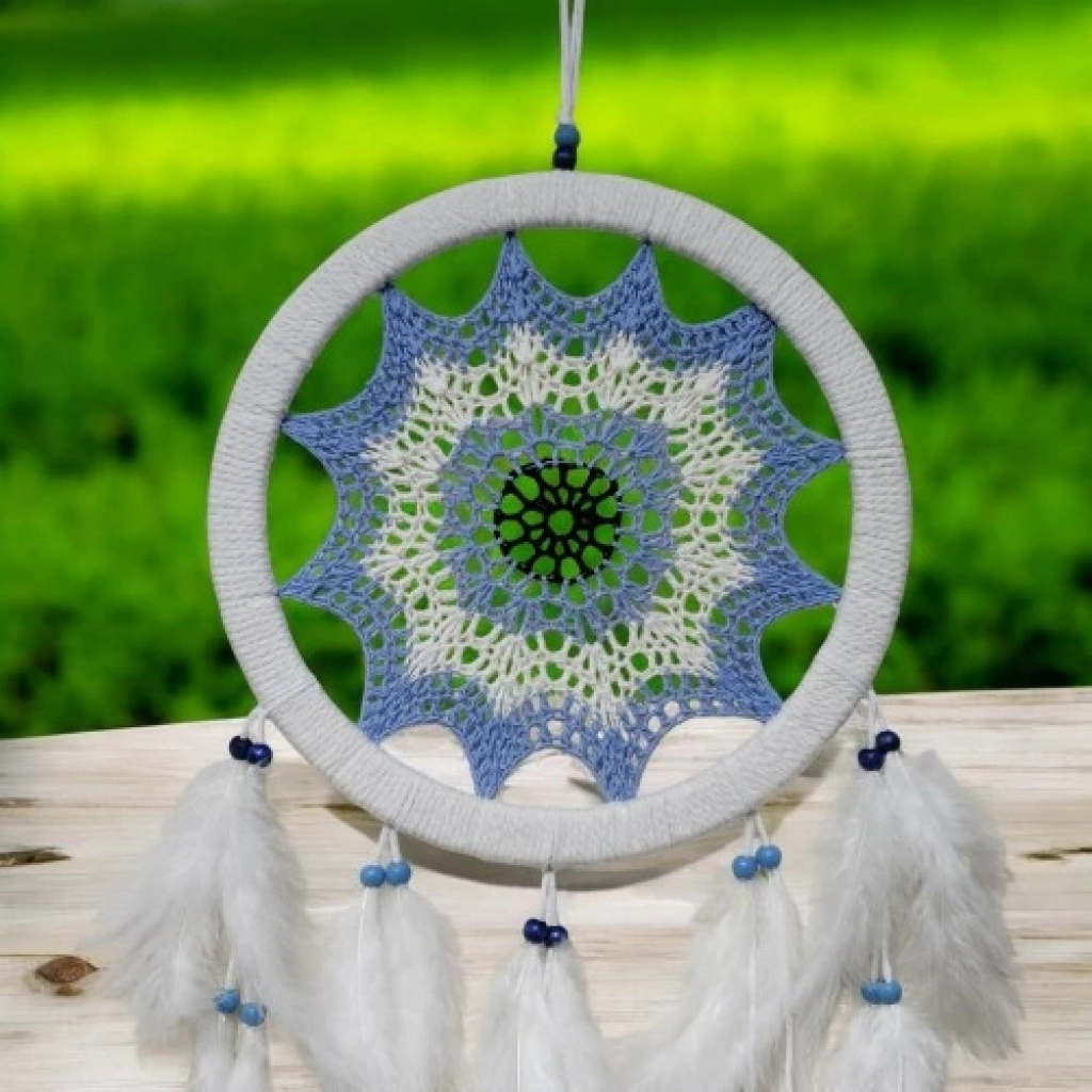 Ürünümüzün yuvarlak kısmı 28 santimetre çapındadır. Ürünümüz ip dahil yaklaşık 70 santimetre boyundadır. Ürünümüz kuş tüyleri ile süslenmiştir. Ürünümüzde doğal ip kullanılmaktadır.Nazar boncuğunun koruyucu özelliğiyle birleşen buz mavisi ve kuş tüylerinin hafifliği, bu duvar süsünü benzersiz kılıyor. Hem modern hem de geleneksel dekorasyonlara uyum sağlayan bu ürün, evinizin her köşesini güzelleştirecek.