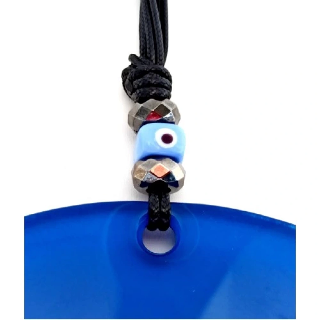 Mavi renk nazar boncuklu deri ipli ürünümüz tamamen el işçiliği ile üretilmiştir. 8 mm kalınlığında birinci kalite camla üretilmiştir. Cam duvar süsümüz 20 santimetre çapındadır. Ürünümüz ip dahil 32 santimetre boyundadır.Özel günlerde sevdiklerinize verebileceğiniz anlamlı bir hediye olan cam nazar boncuklu duvar süsü, yeni evlenen çiftlere veya evine farklılık katmak isteyenlere hitap ediyor. El işçiliği ile üretilen bu ürün, uzun yıllar kullanabileceğiniz özel bir parça.