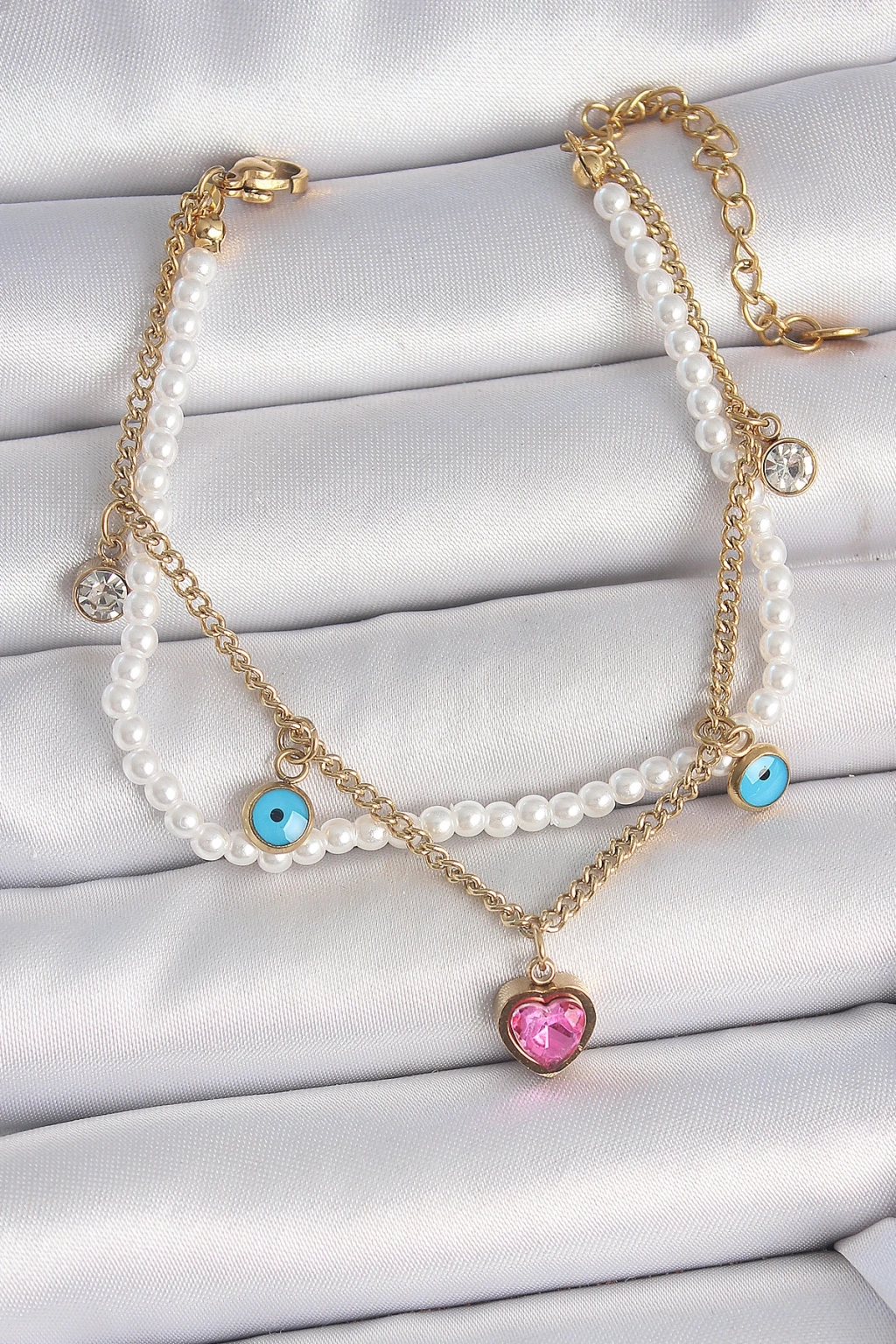 Dodes Dodes 316L Çelik Gold Renk 2'Li İncili Zincir Sallantı Pembe Kalp Model Nazar Boncuk Detay Kadın Bileklik TG27BB6949