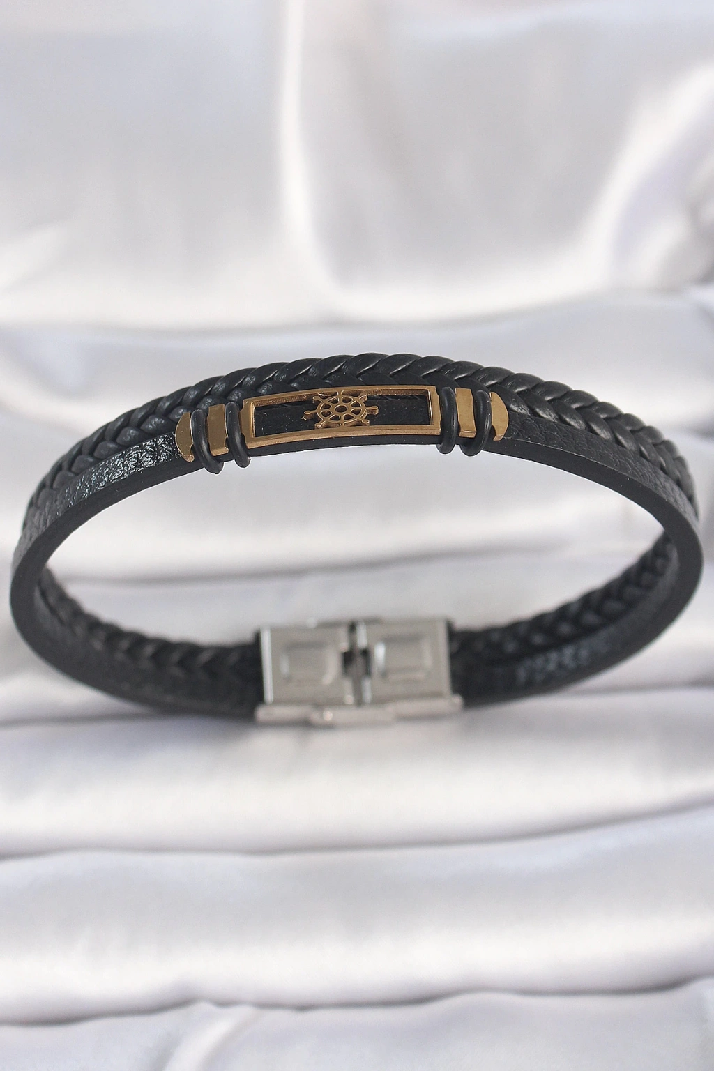 Dodes Dodes 316L Çelik Gold Renk Gemi Dümeni Aksesuarlı Çift Sıra Burgu Desenli Deri Kordon Erkek Bileklik TG27EB3713