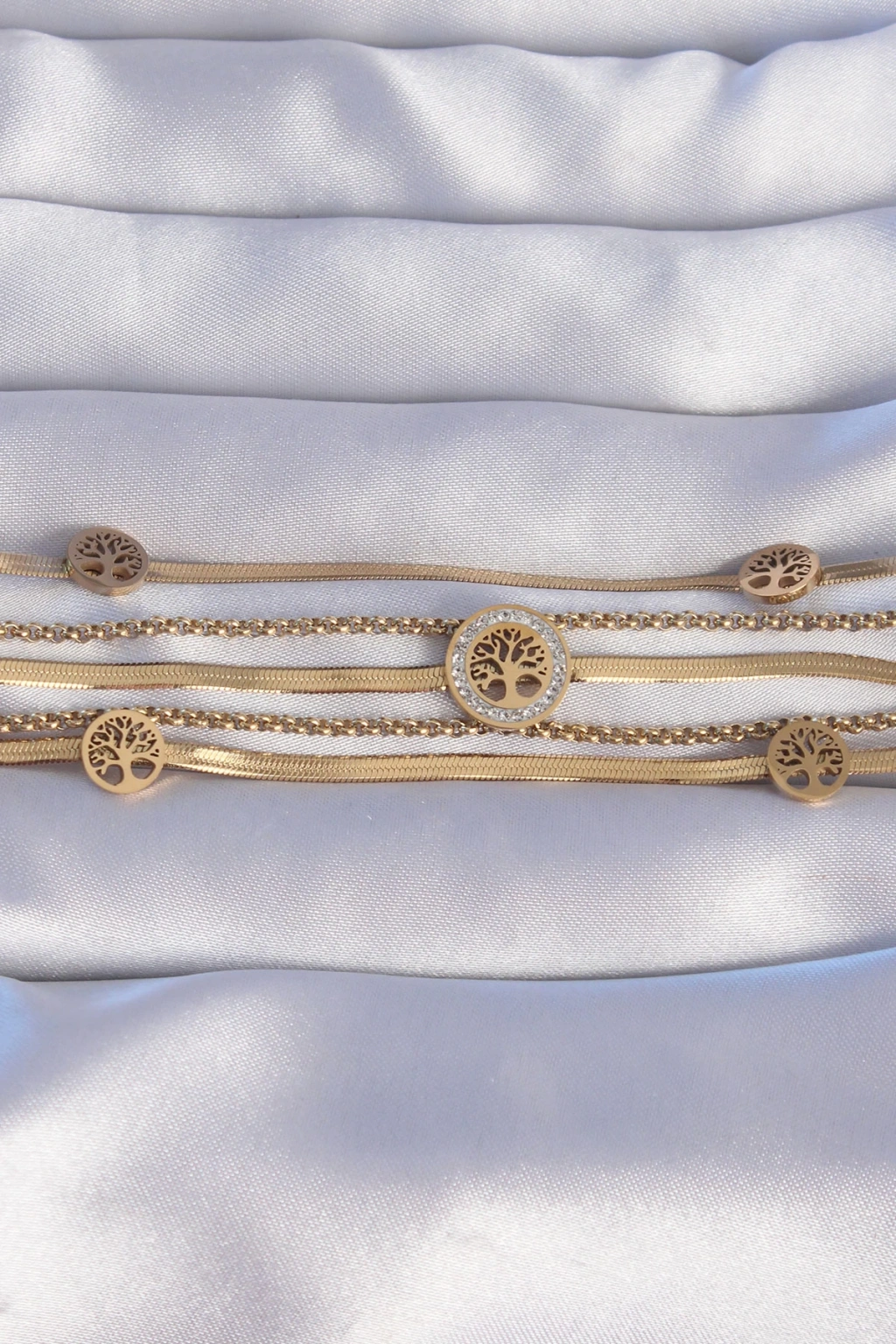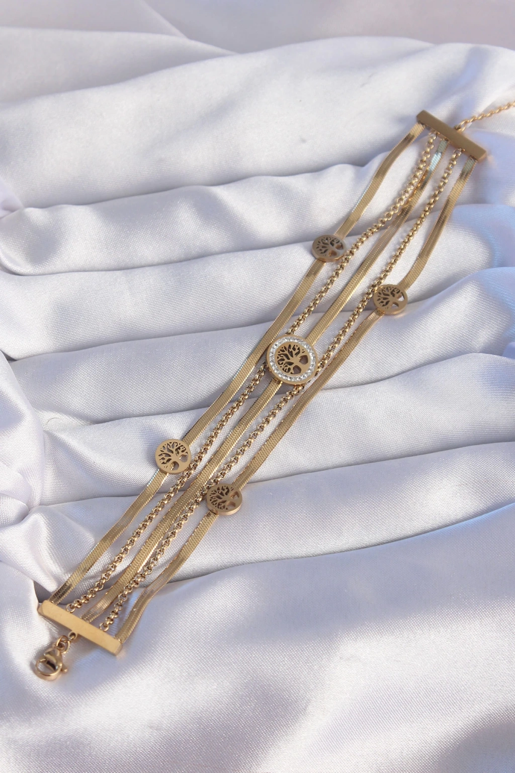 Dodes Dodes 316L Çelik Gold Renk İtalyan Zincir Detaylı Zirkon Taşlı Yaşam Ağacı Tasarımlı Çoklu Bileklik TG27BB6205