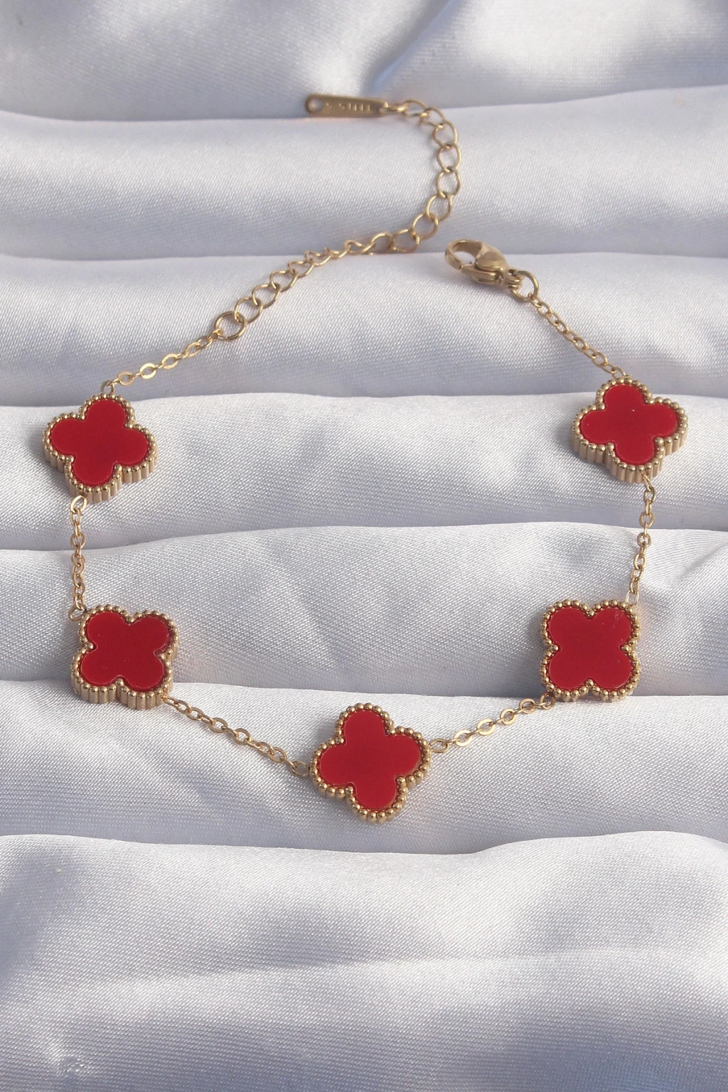 Dodes Dodes 316L Çelik Gold Renk Kırmızı Mineli Yonca Bileklik TG27BB6264