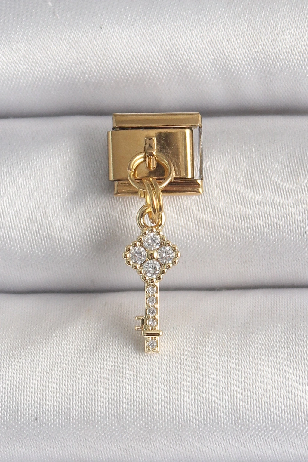 Dodes Dodes 316L Çelik Gold Renk Sallantı Zirkon Taşlı Anahtar Model Nomination Charm TG27BC1347
