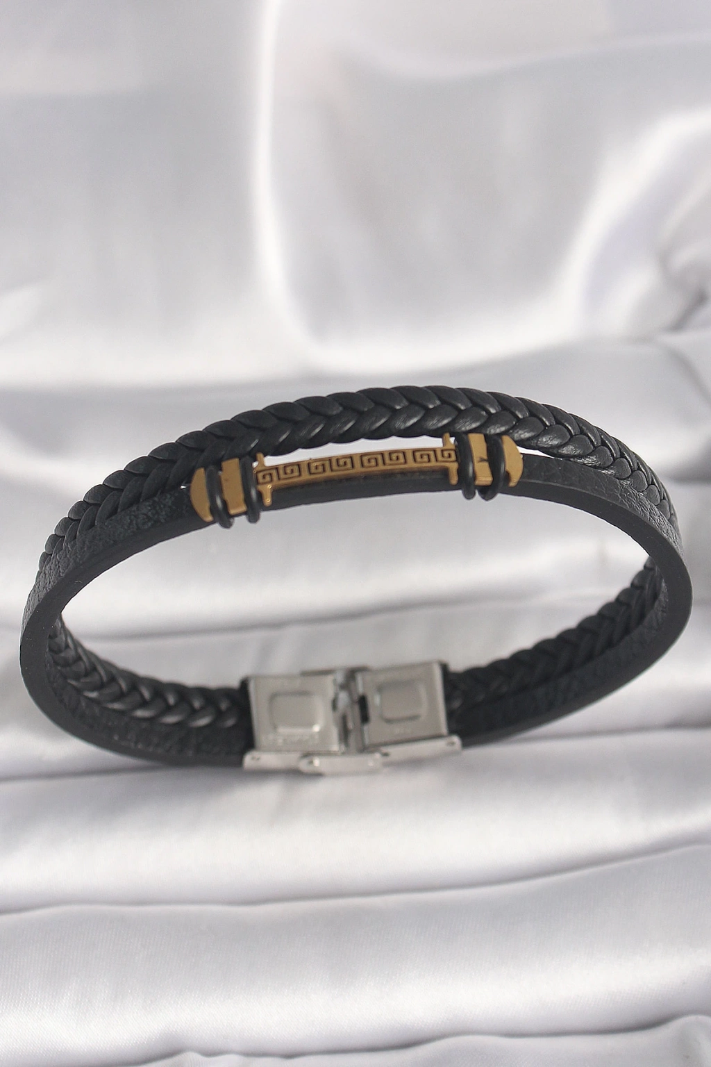 Dodes Dodes 316L Çelik Gold Renk ZikZak İşlemeli Aksesuarlı Çift Sıra Burgu Desenli Deri Kordon Erkek Bileklik TG27EB3705