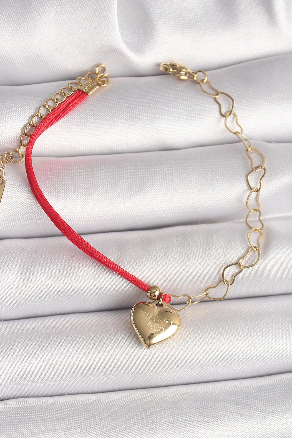Dodes Dodes 316L Çelik Gold Renk Zincir Kırmızı İp Model Sallantı Kalp Figür İşleme Detaylı Kadın Bileklik TG27BB6868