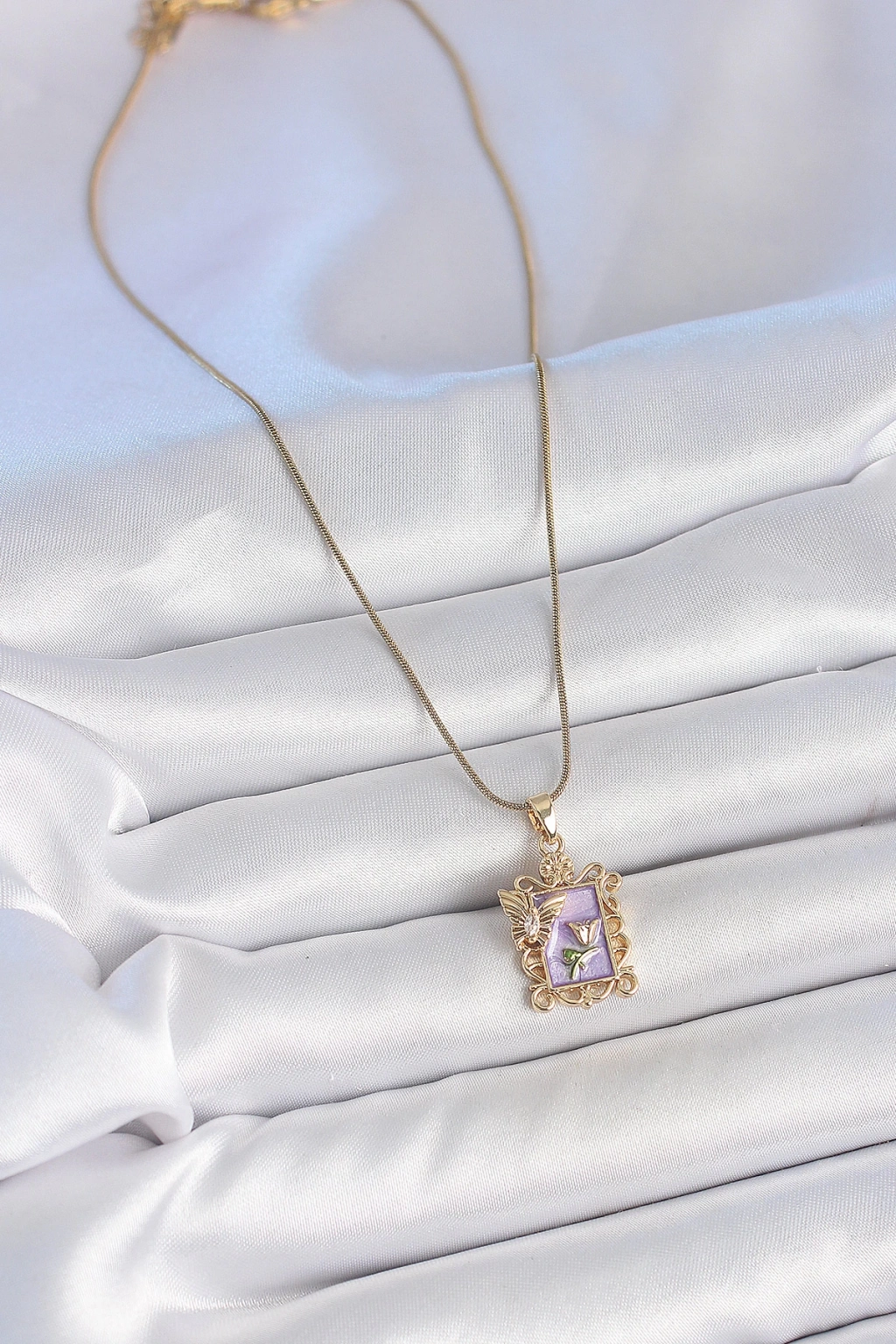 Dodes Dodes 316L Çelik Gold Renk Zincir Mor Mineli Çiçek İşlemeli Zirkon Taşlı Kelebek Detay Portre Model Kadın Kolye TG27BKO10190