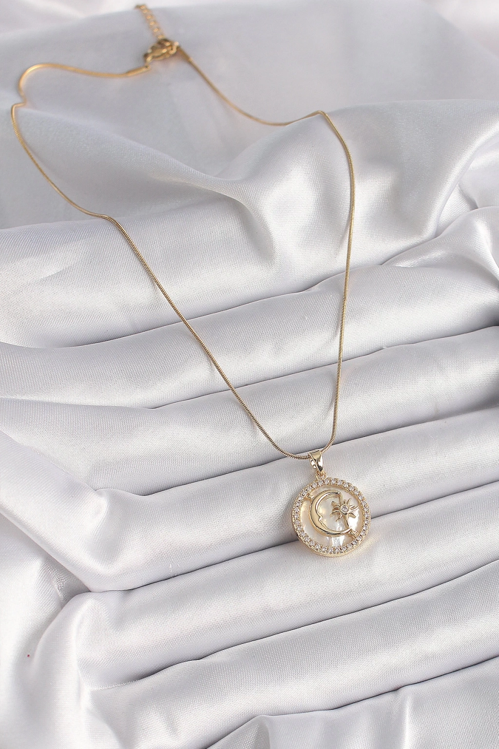 Dodes Dodes 316L Çelik Gold Renk Zincir Zirkon Taş Detaylı Beyaz Sedefli Ay Yıldız Model Kadın Kolye TG27BKO9638