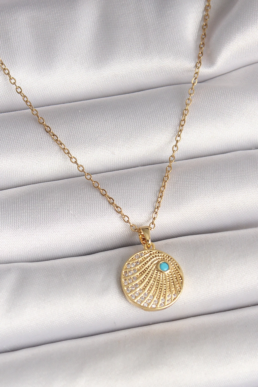 Dodes Dodes 316L Çelik Gold Renk Zincir Zirkon Taş İşlemeli Mavi Taş Detaylı Madalyon Model Kadın Kolye TG27BKO9964