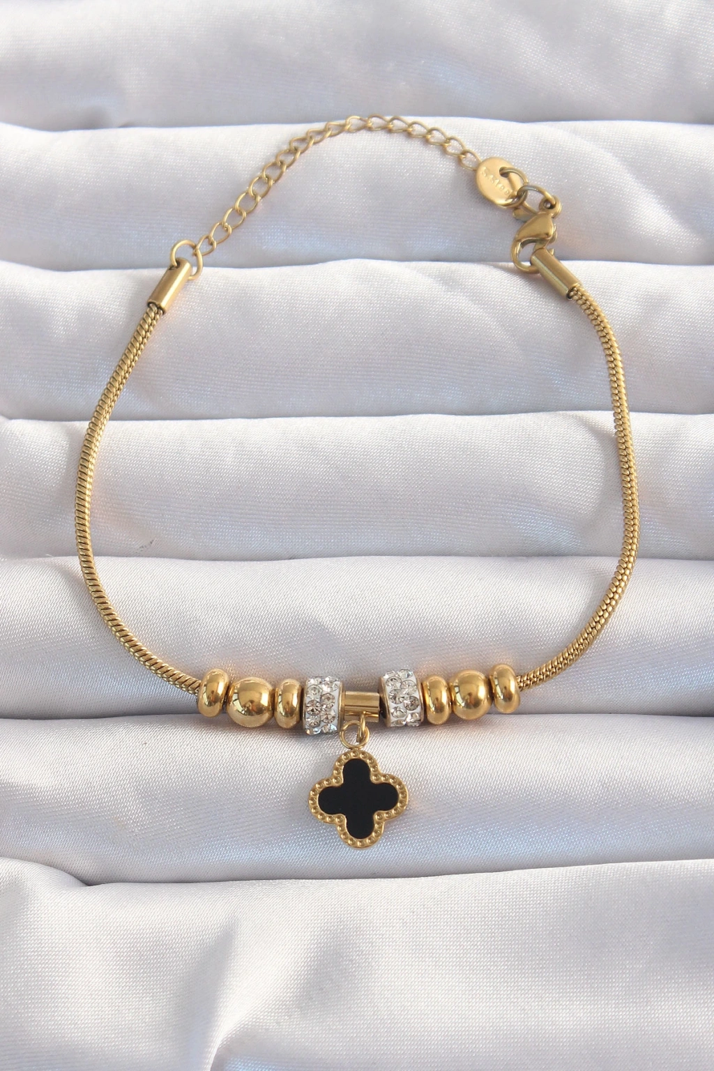 Dodes Dodes 316L Çelik Gold Renk Zirkon Taş Aksesuarlı Siyah Mineli Yonca Bileklik TG27BB6229