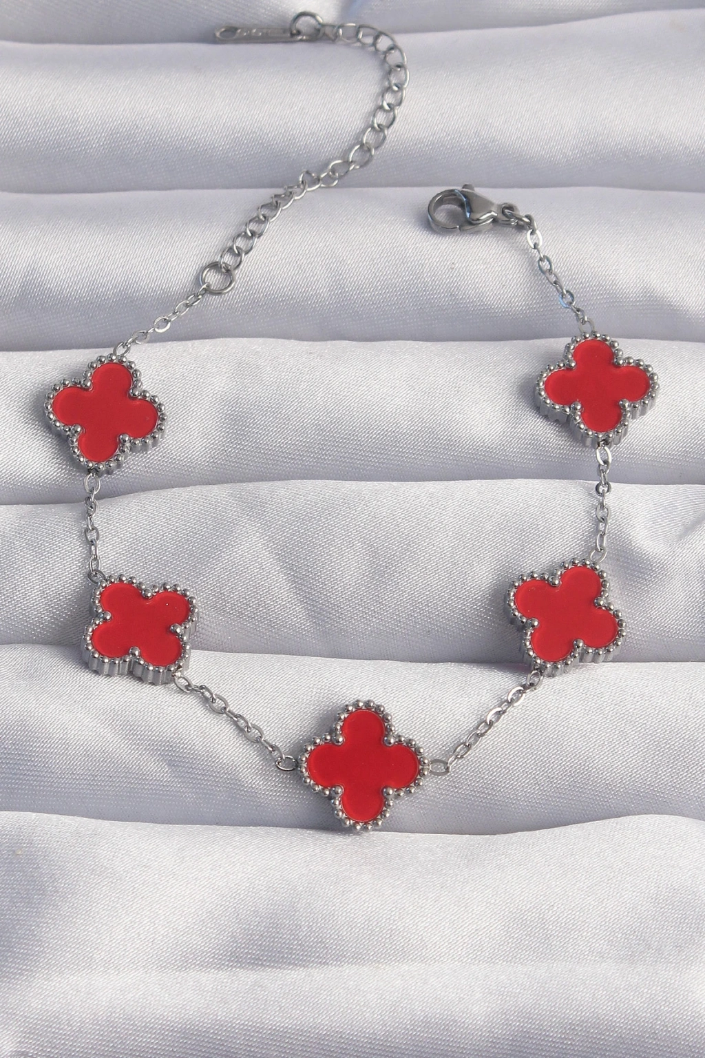 Dodes Dodes 316L Çelik Gümüş Renk Kırmızı Mineli Yonca Bileklik TG27BB6263