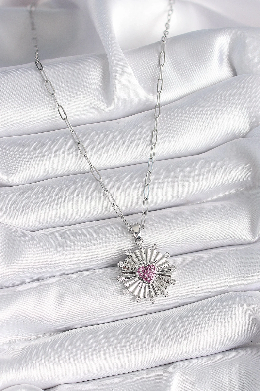 Dodes Dodes 316L Çelik Gümüş Renk Pembe Zirkon Taşlı Kalp İşleme Madalyon Model Kadın Kolye TG27BKO9533