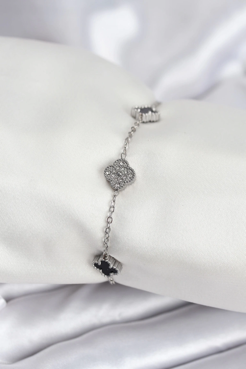 Dodes Dodes 316L Çelik Gümüş Renk Siyah ve Zirkon Taşlı Baby Boy Yonca Kadın Bileklik TG27BB7954