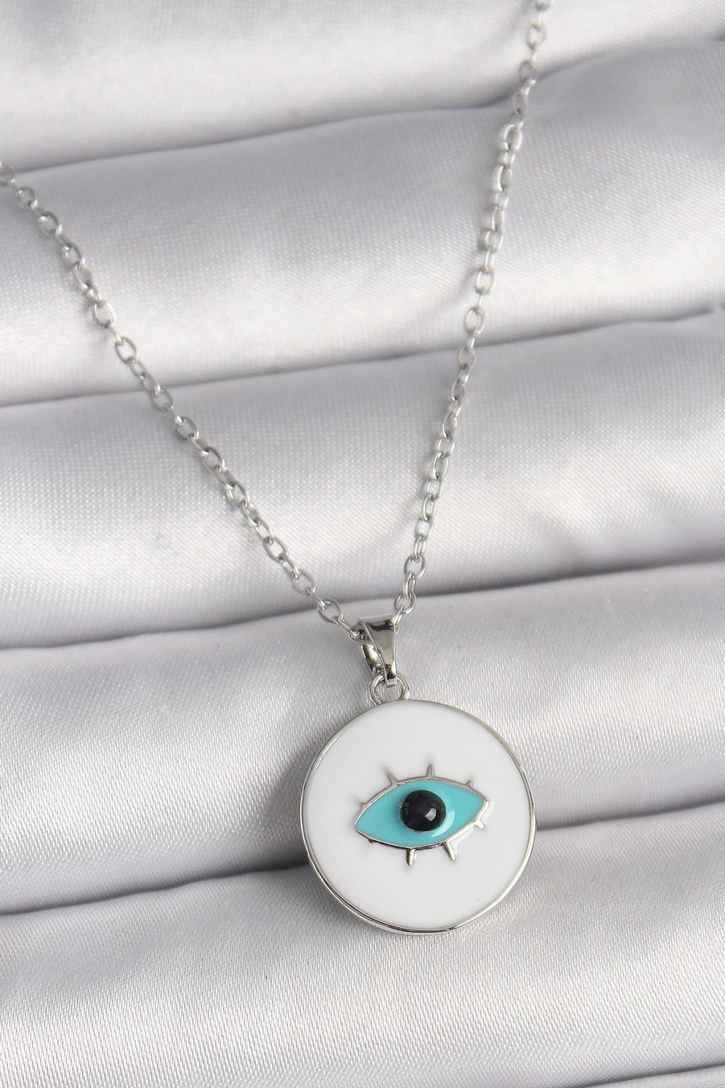 Dodes Dodes 316L Çelik Gümüş Renk Zincir Beyaz Mineli Turkuaz Göz İşleme Model Kadın Kolye TG27BKO9729