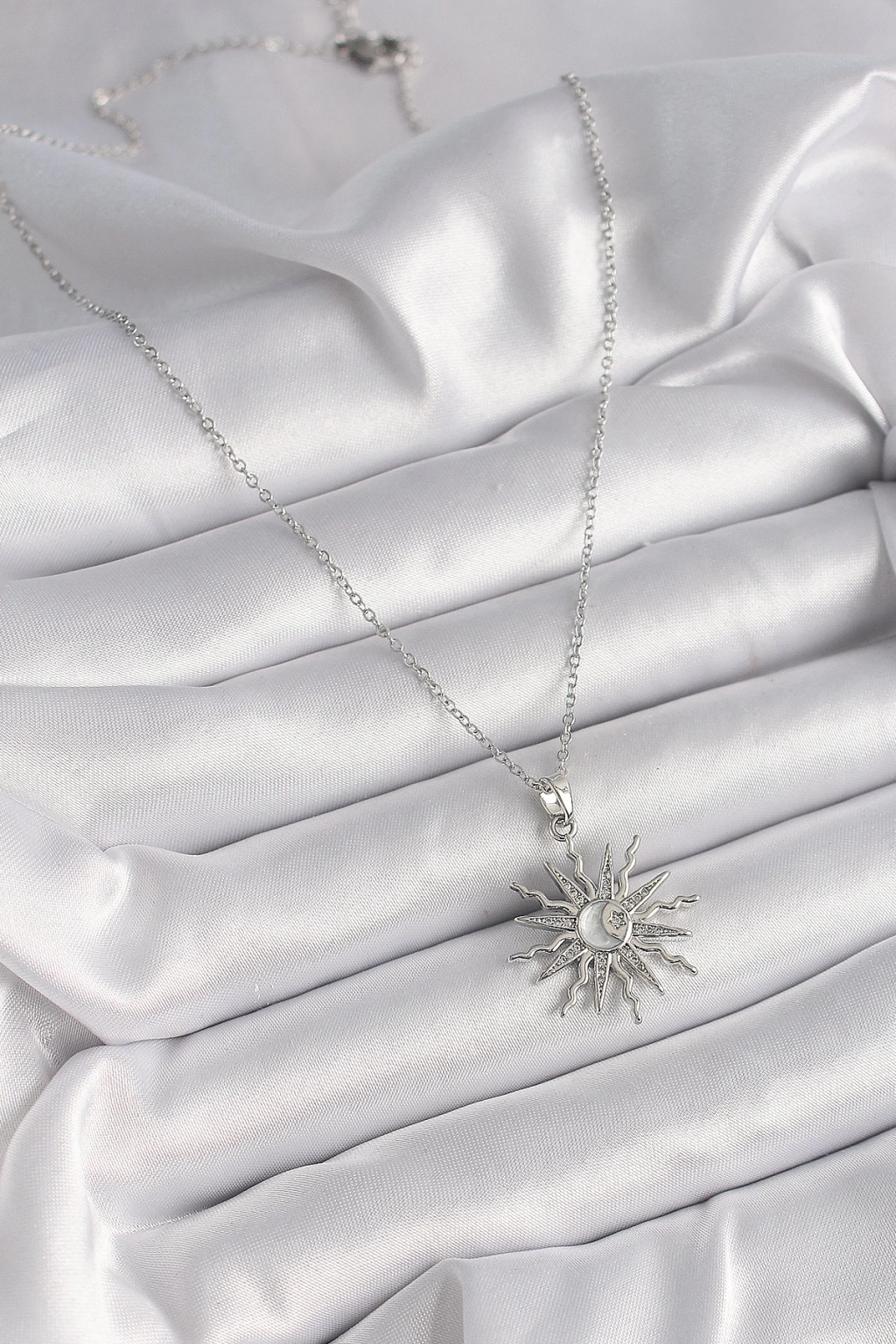 Dodes Dodes 316L Çelik Gümüş Renk Zincir Zirkon Taşlı Güneş Model Sedefli Ay İşleme Detay Kadın Kolye TG27BKO9631