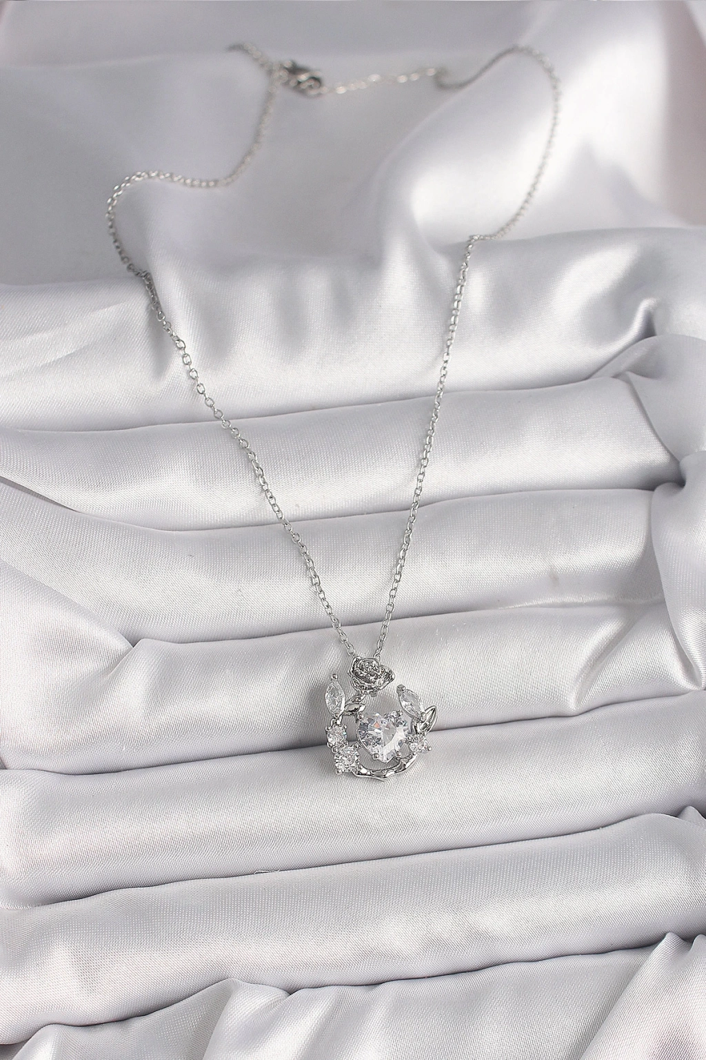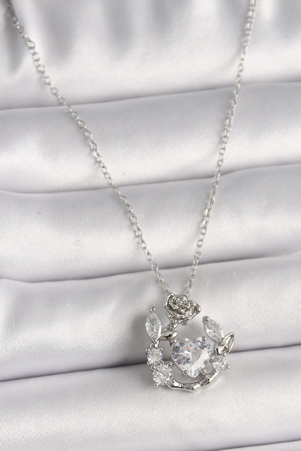 Dodes Dodes 316L Çelik Gümüş Renk Zincir Zirkon Taşlı Kalp Figür Gül Detay Kadın Kolye TG27BKO9809