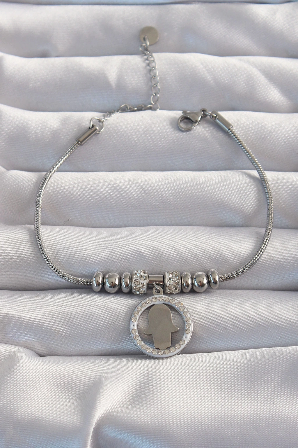 Dodes Dodes 316L Çelik Gümüş Renk Zirkon Taş Aksesuarlı Fatma Ana Eli Bileklik TG27BB6234