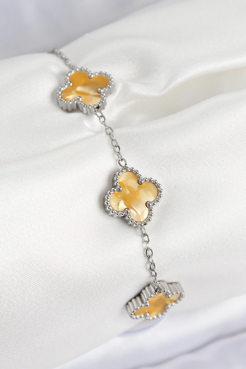 Dodes Dodes 316L Çelik Sedefli Kehribar Sarı Gümüş Renk Yonca Kadın Bileklik TG27BB7676