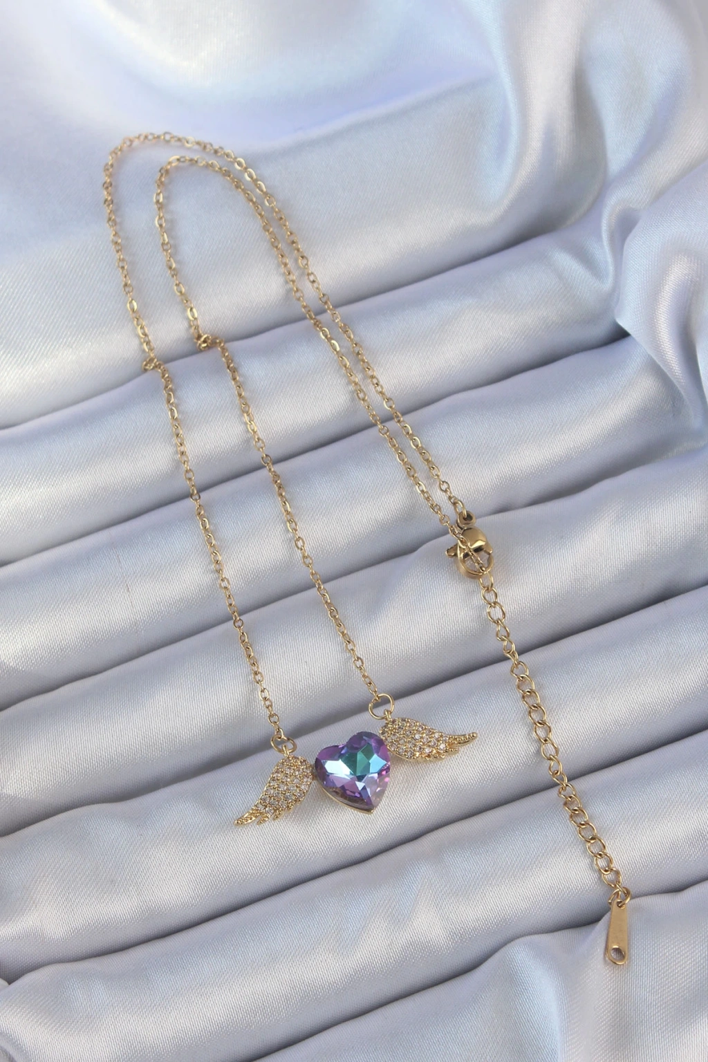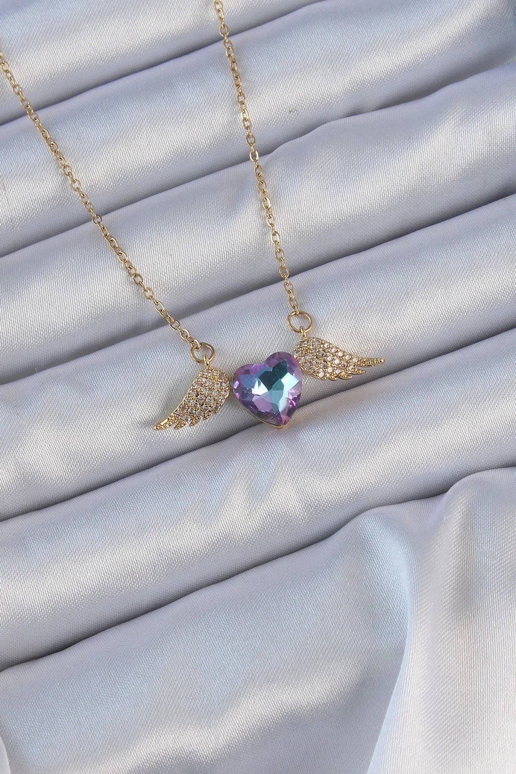 Dodes Dodes 316L Çelik Zincir Altın Renk Mavi Mor Zirkon Taşlı Kanatlı Kalp Kolye TG27BKO9161