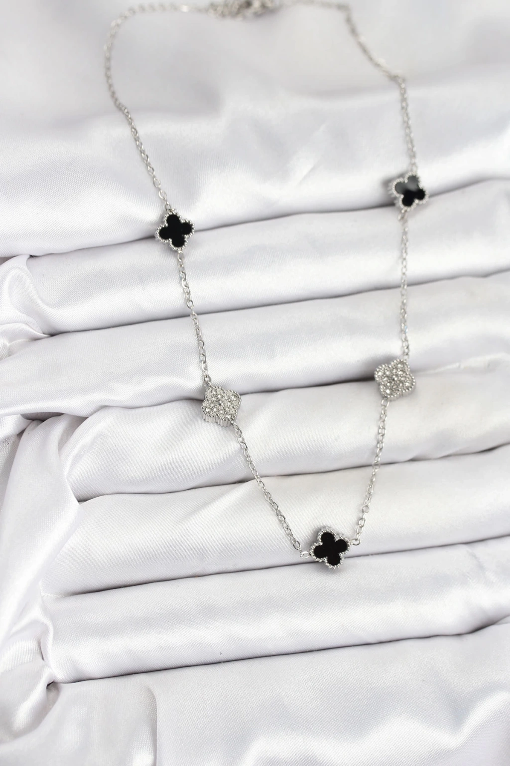 Dodes Dodes 316L Çelik Zincir Gümüş Renk Siyah ve Zirkon Taşlı Yonca Kadın Kolye TG27BKO10589