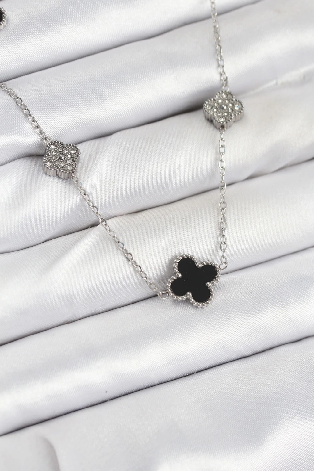 Dodes Dodes 316L Çelik Zincir Gümüş Renk Siyah ve Zirkon Taşlı Yonca Kadın Kolye TG27BKO10589
