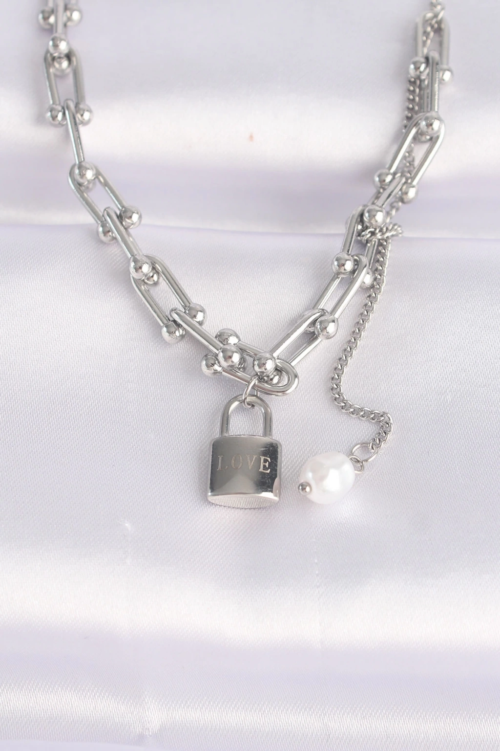 Dodes Dodes 316L Çelik Zincir Gümüş Renk Zincirli Love Yazılı Kilit Kolye TG27BKO8633