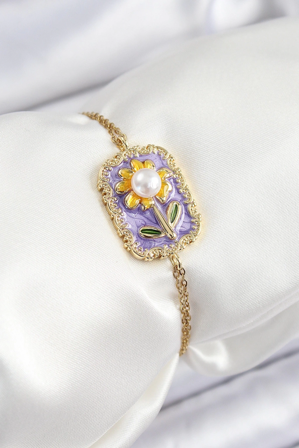 Dodes Dodes 316L Çelik Zincir Mor Mineli Sanatsal Portre İnci Detaylı Papatya Model Gold Renk Kadın Bileklik TG27BB7231