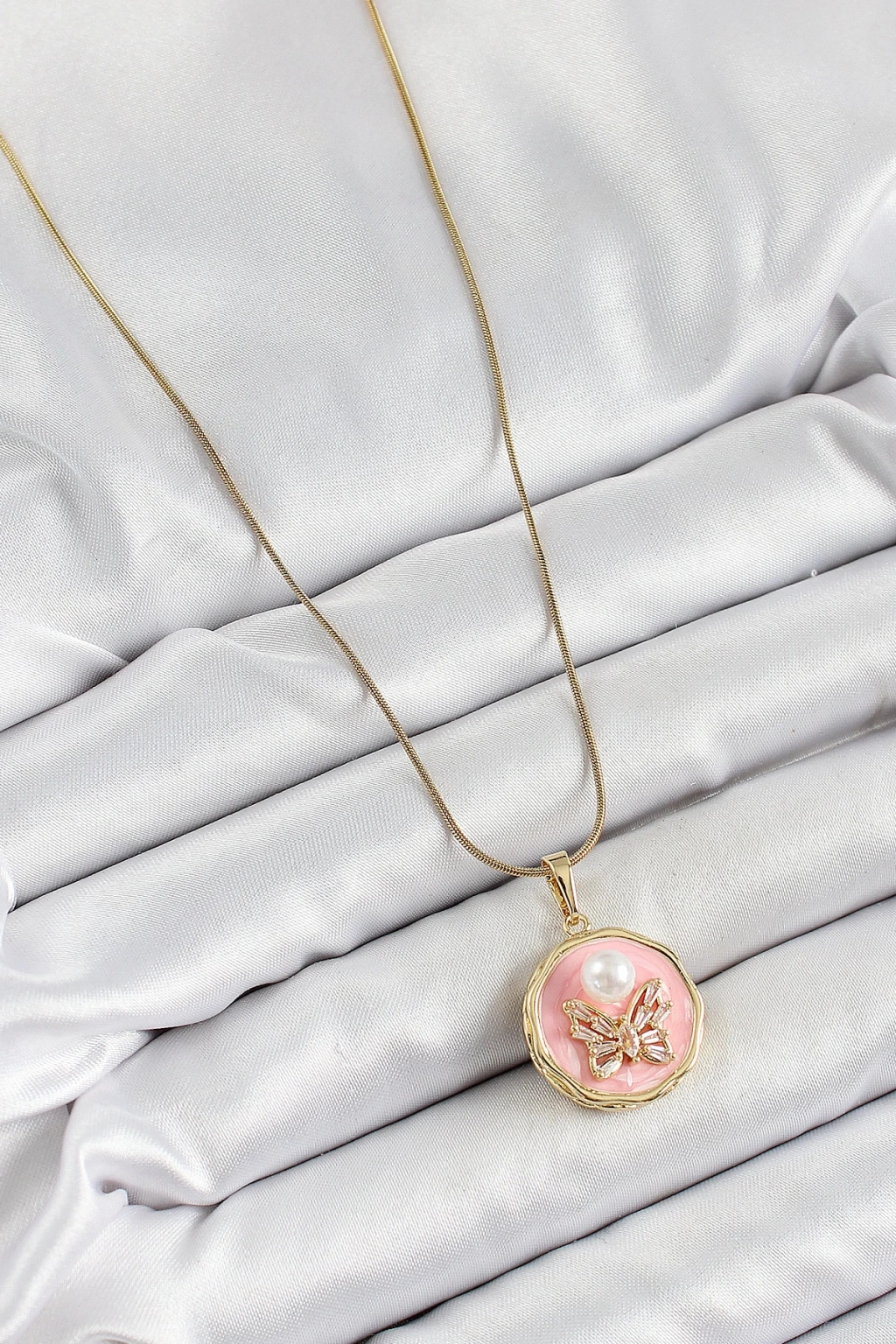 Dodes Dodes 316L Çelik Zincir Zirkon Taşlı Pembe Sanatsal Portre İnci Detaylı Kelebek Model Gold Renk Kadın Kolye TG27BKO10276