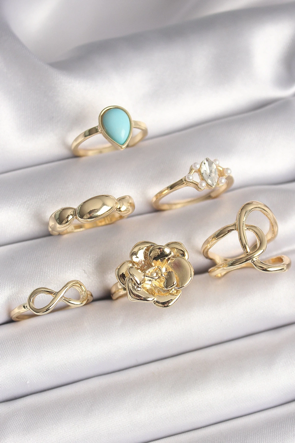 Dodes Dodes Pirinç Gold Renk Çiçek Model Model Sonsuzluk Zirkon Taş Detaylı 6'Lı Kadın Yüzük Seti TG27BYK3612