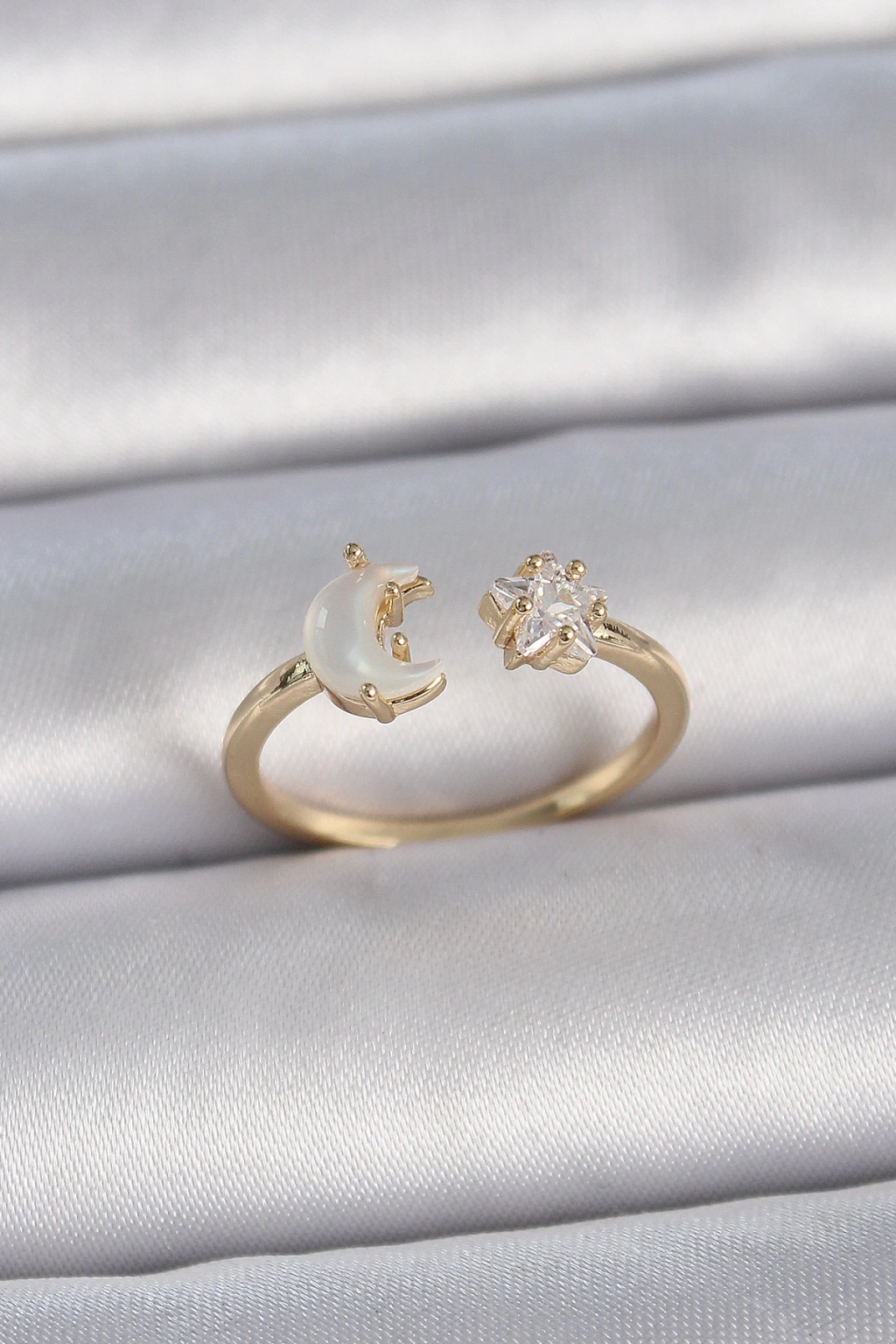 Dodes Dodes Pirinç Gold Renk İncili Hilal Zirkon Taşlı Yıldız Ayarlanabilir Model Kadın Yüzük TG27BYK3360