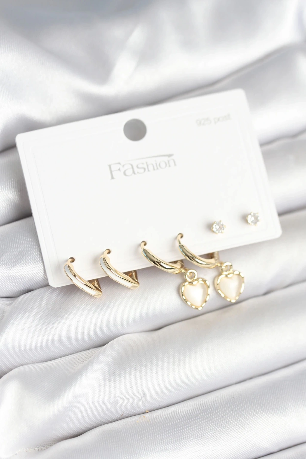 Dodes Dodes Pirinç Gold Renk Kalp Detaylı 925 Ayar Gümüş Çivili Kadın Küpe Seti TG27BKP11258