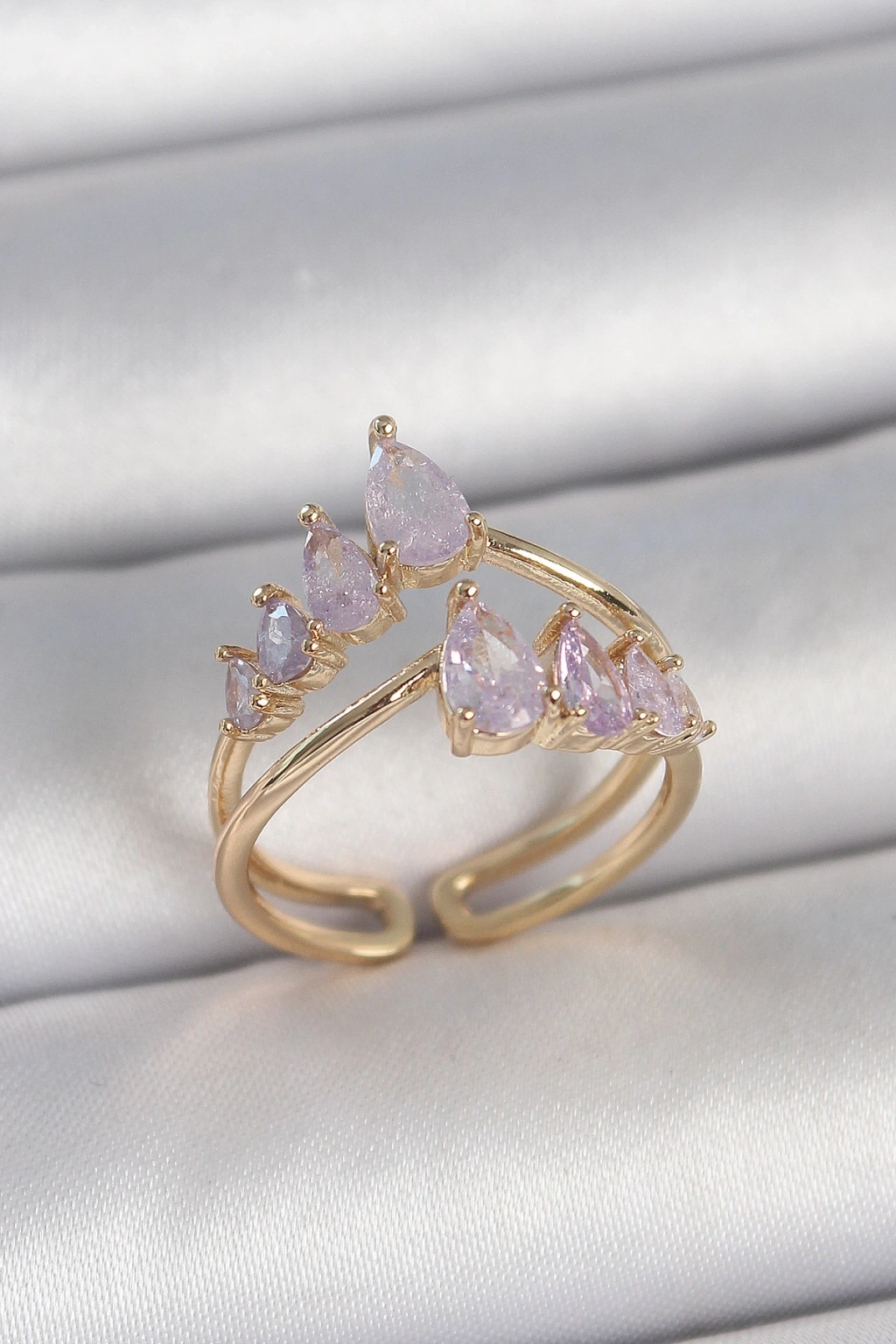 Dodes Dodes Pirinç Gold Renk Mor Damla Zirkon Taşlı Taç Model Kadın Yüzük TG27BYK3715
