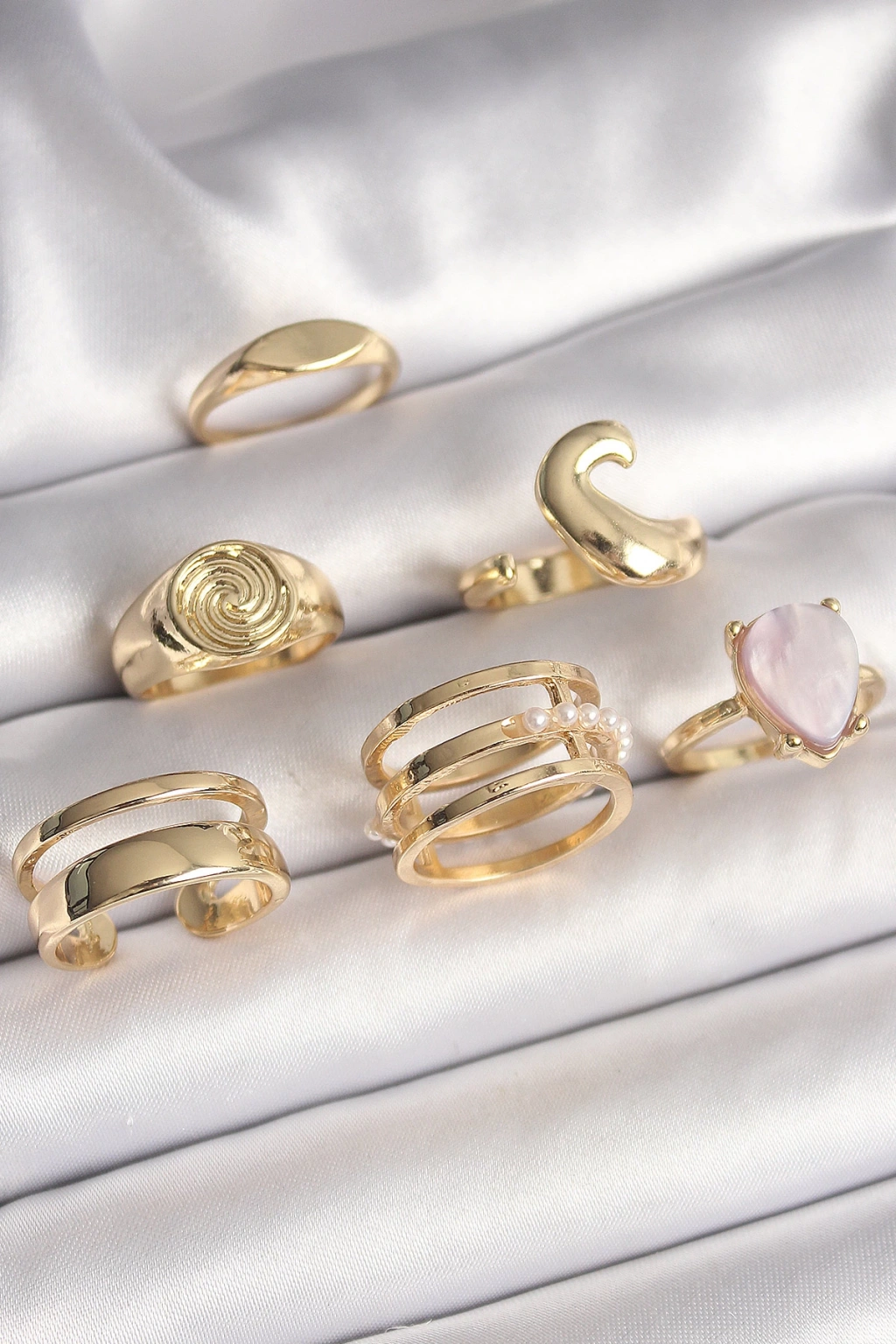 Dodes Dodes Pirinç Gold Renk Pembe Damla Mineli Sarmal İşleme Detaylı 6'Lı Kadın Yüzük Seti TG27BYK3628