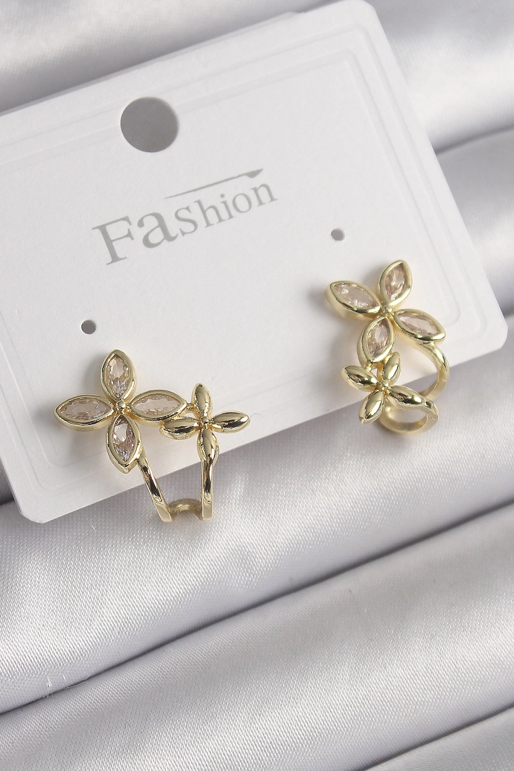 Dodes Dodes Pirinç Gold Renk Zirkon Taşlı 2'Li Çiçek Model Kadın Küpe TG27BKP9961