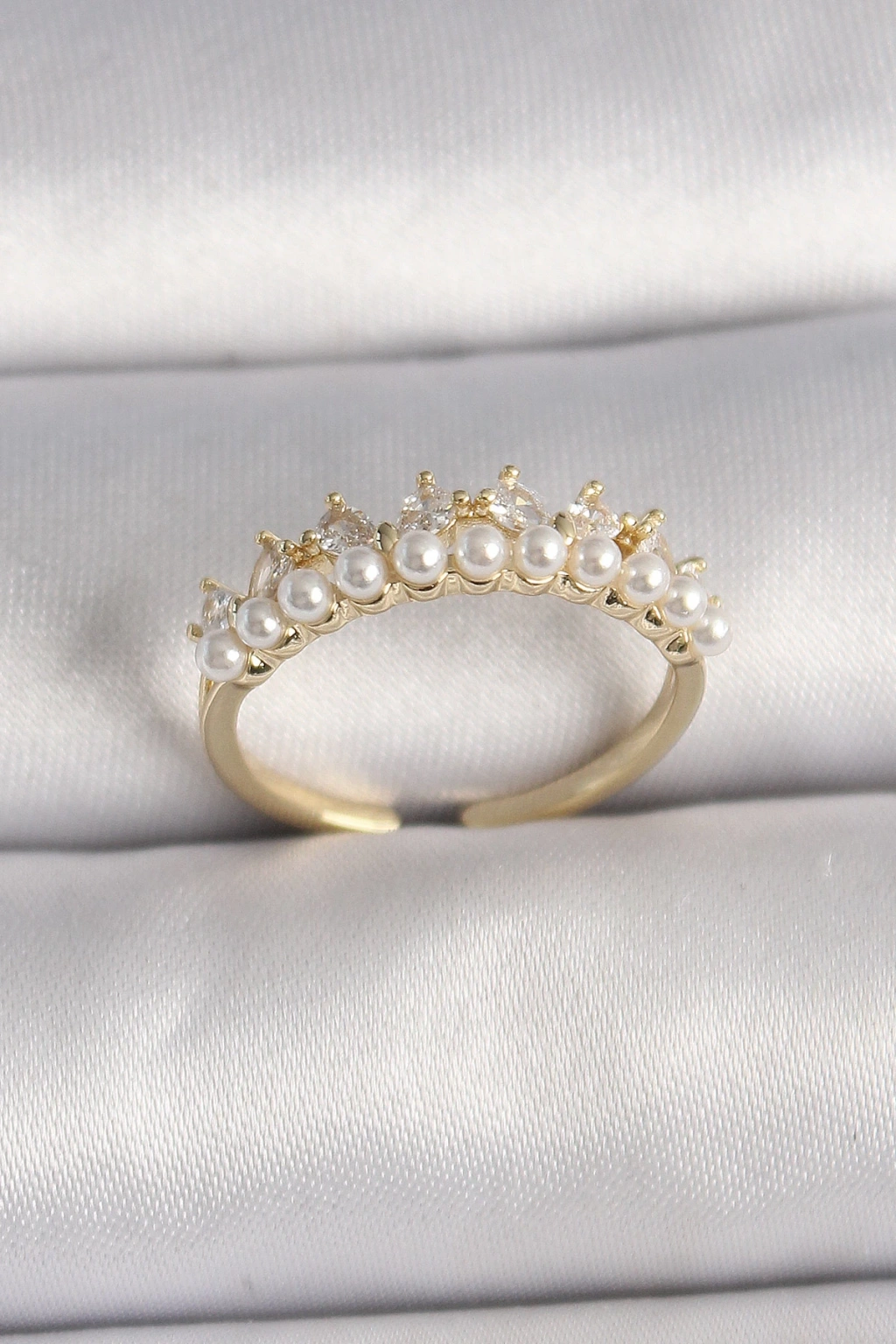 Dodes Dodes Pirinç Gold Renk Zirkon Taşlı İncili Taç Model Ayarlanabilir Kadın Yüzük TG27BYK3576