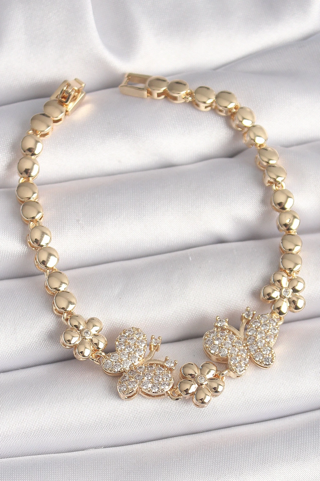 Dodes Dodes Pirinç Gold Renk Zirkon Taşlı Kelebek Figür Çiçek Zincir Model Kadın Bileklik TG27BB6826