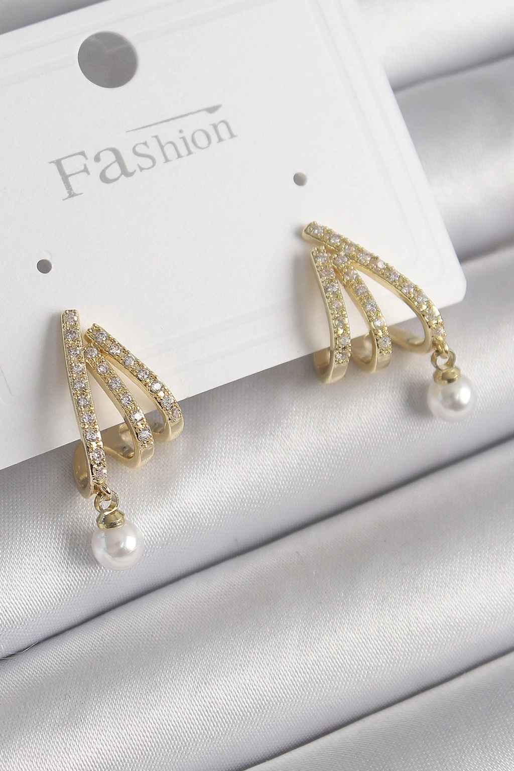 Dodes Dodes Pirinç Gold Renk Zirkon Taşlı Pençe Model İnci Detay Kadın Küpe TG27BKP9957