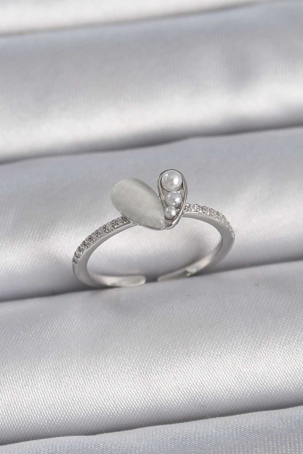 Dodes Dodes Pirinç Gümüş Renk Ayarlanabilir Zirkon Taşlı İncili Beyaz Mineli Kalp Model Kadın Yüzük TG27BYK3377