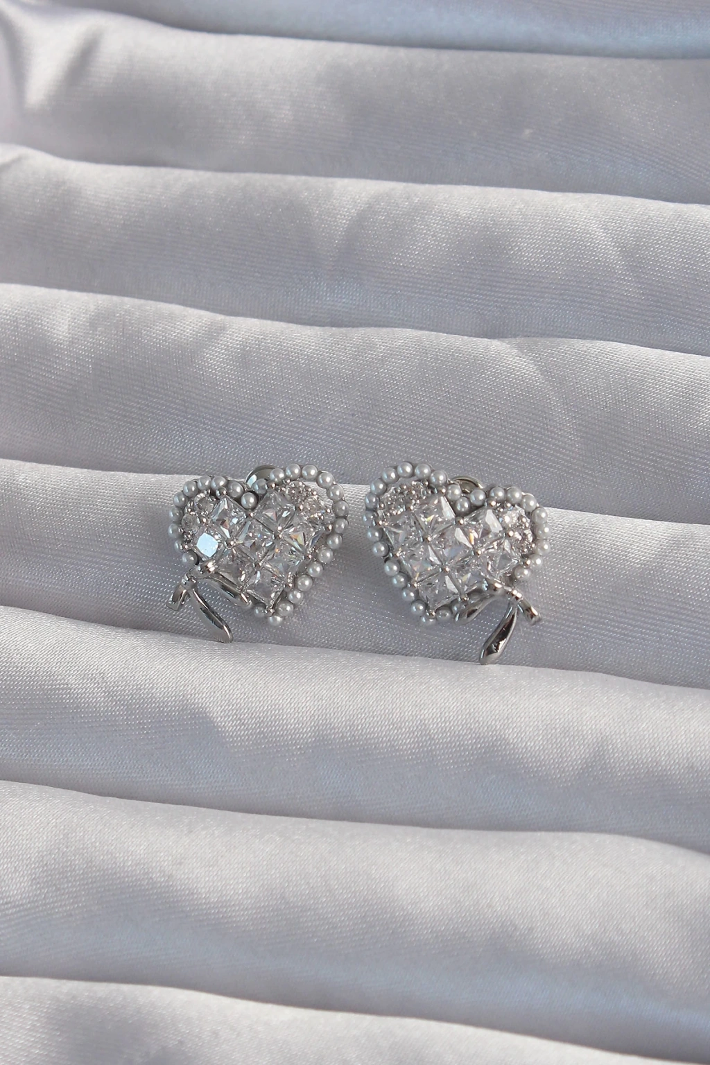 Dodes Dodes Pirinç Gümüş Renk Fiyonk Detay İncili Zirkon Taşlı Kalp Küpe TG27BKP9298