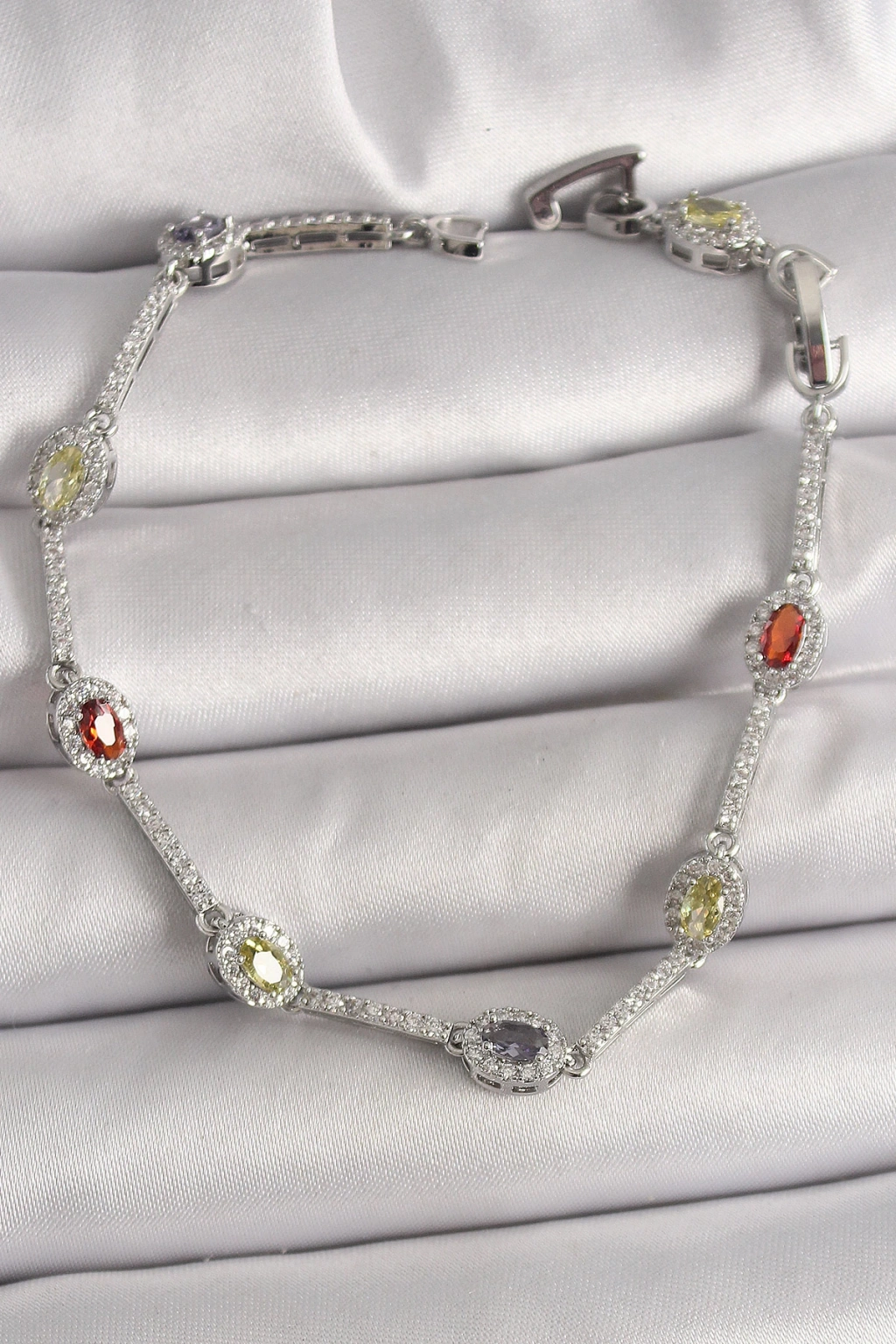 Dodes Dodes Pirinç Gümüş Renk Renkli Zirkon Taşlı Damla Taş Model Kadın Bileklik TG27BB6873