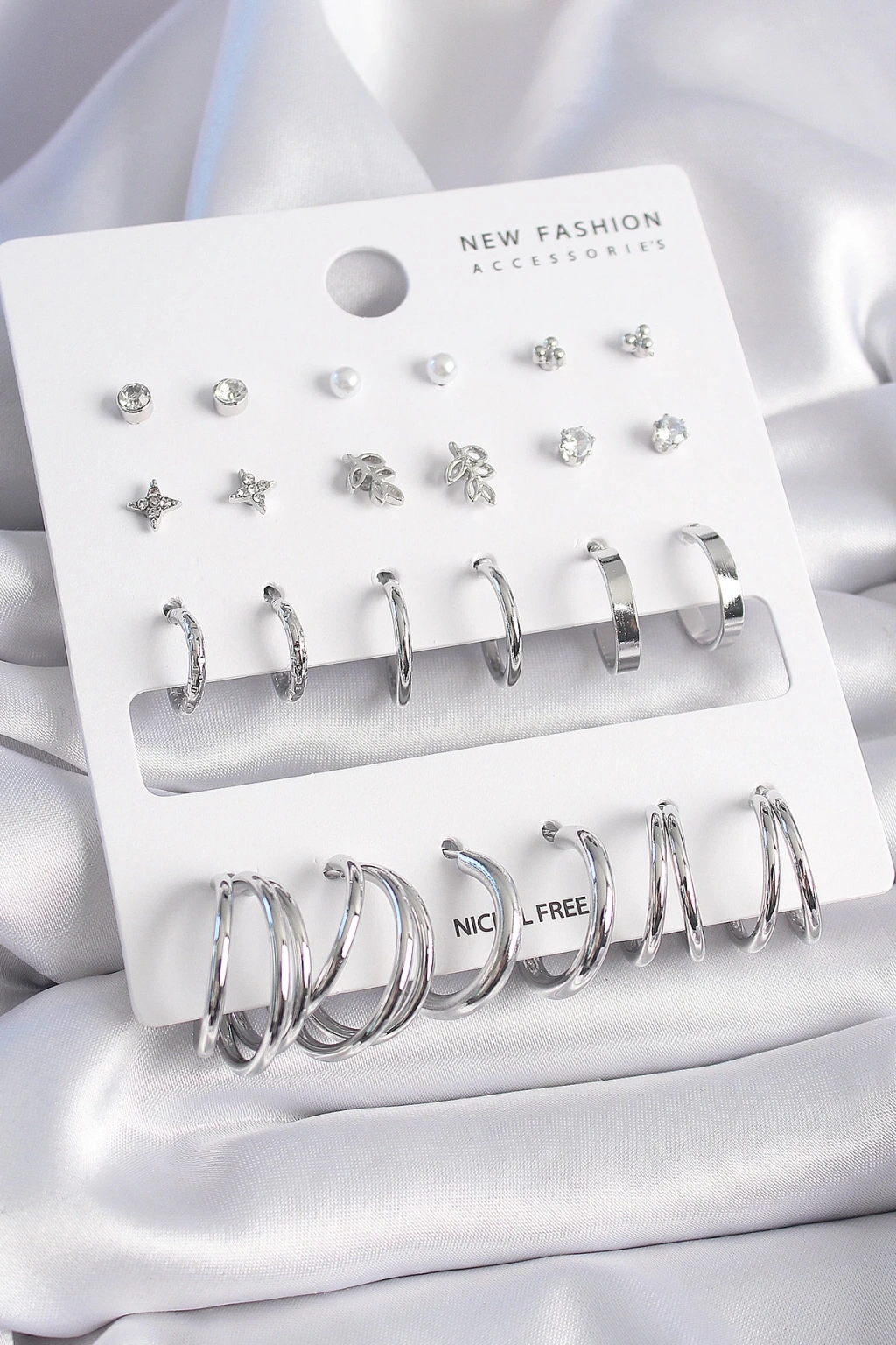 Dodes Dodes Pirinç Gümüş Renk Zirkon Taşlı 12 Çift Küpe Seti TG27BKP9681