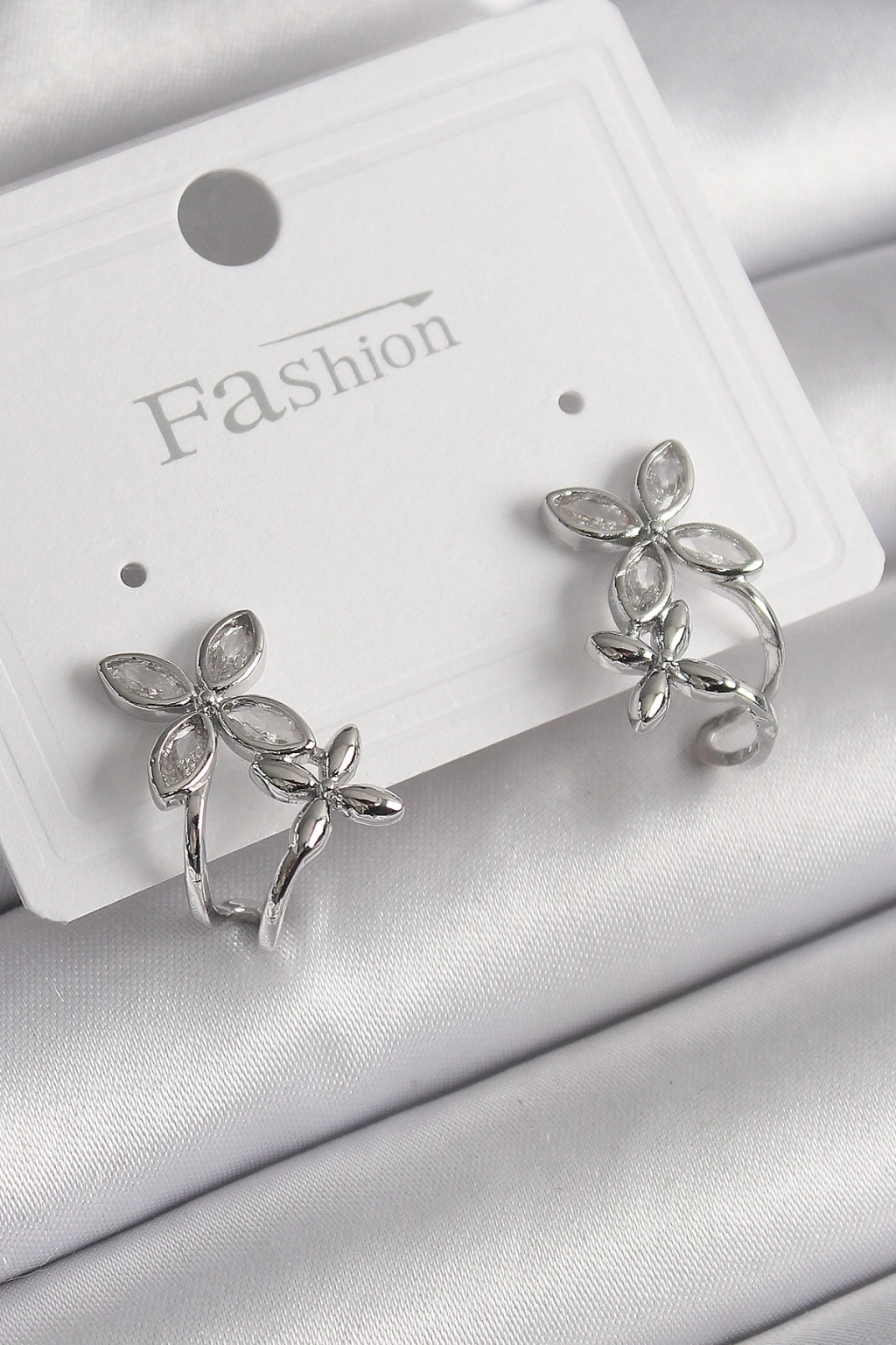 Dodes Dodes Pirinç Gümüş Renk Zirkon Taşlı 2'Li Çiçek Model Kadın Küpe TG27BKP9962