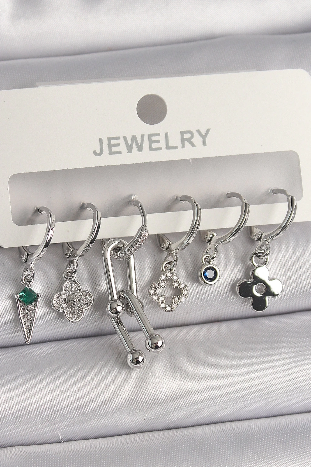 Dodes Dodes Pirinç Gümüş Renk Zirkon Taşlı Çoklu Figür Kadın Küpe Seti TG27BKP10097