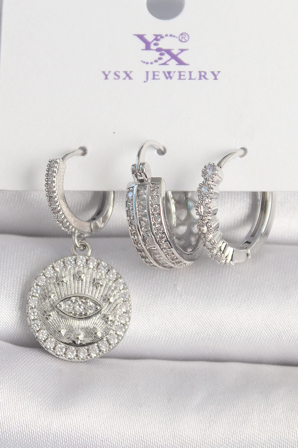Dodes Dodes Pirinç Gümüş Renk Zirkon Taşlı Göz İşlemeli Halka Model 3'Lü Kadın Kombin Küpe TG27BKP10436