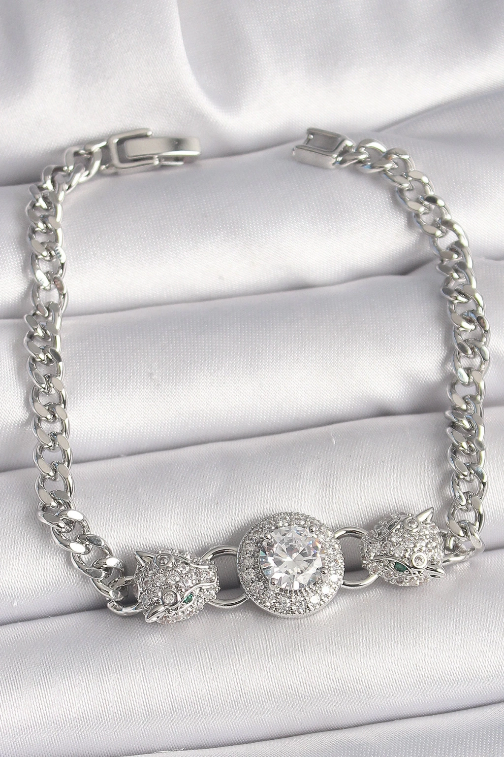 Dodes Dodes Pirinç Gümüş Renk Zirkon Taşlı Leopar Figür Zincir Model Kadın Bileklik TG27BB6829
