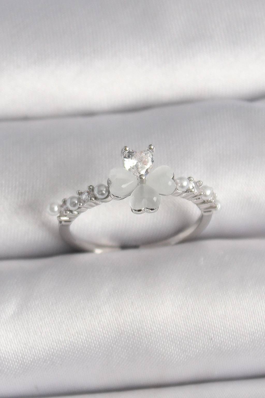 Dodes Dodes Pirinç Gümüş Renk Zirkon Taşlı Yonca Model İnci Detay Ayarlanabilir Yüzük TG27BYK3552