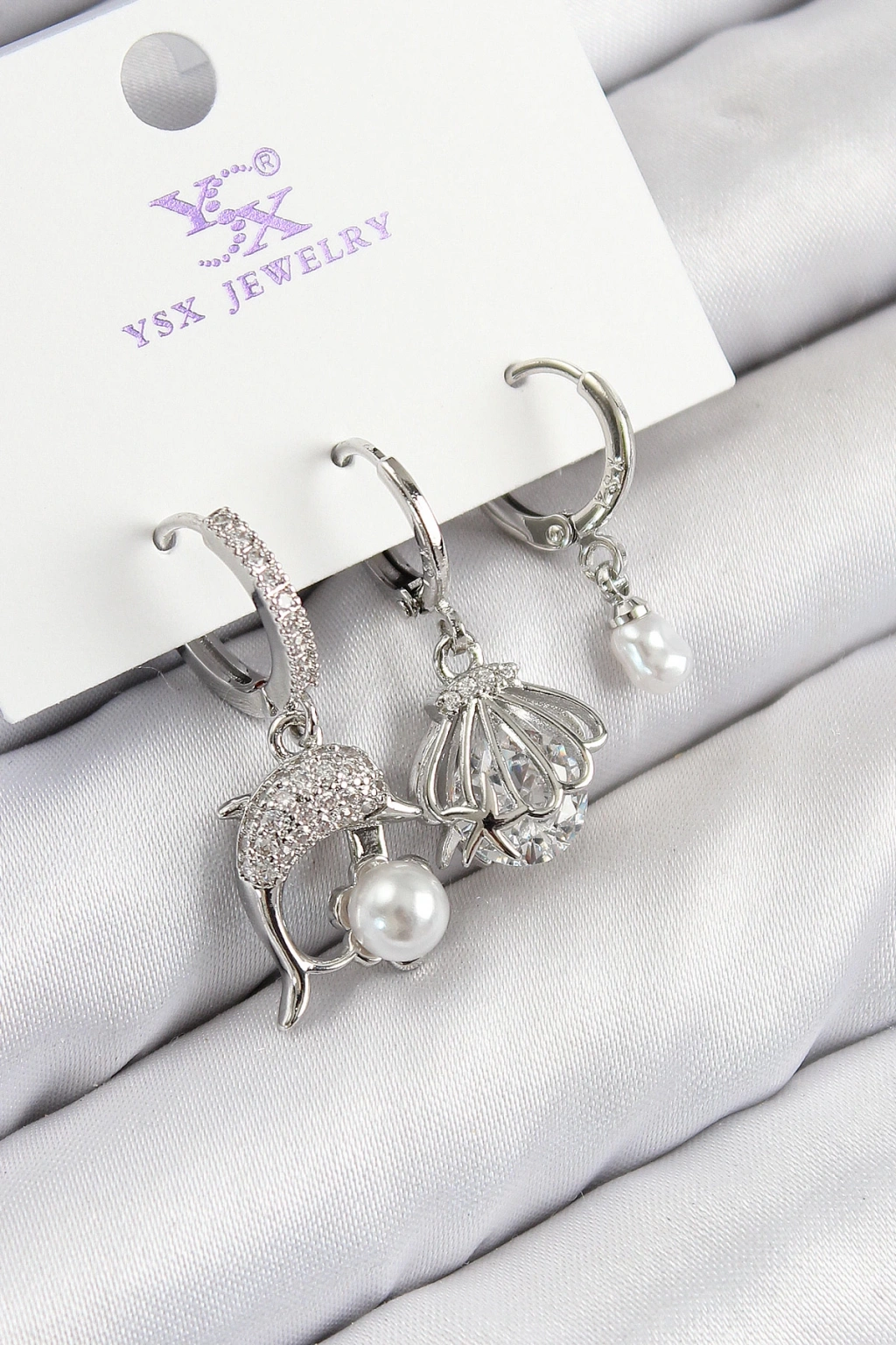 Dodes Dodes Pirinç Zirkon Taşlı 3'lü Yunus Balığı Ve İstiridye Model Gümüş Renk Kadın Küpe TG27BKP11127