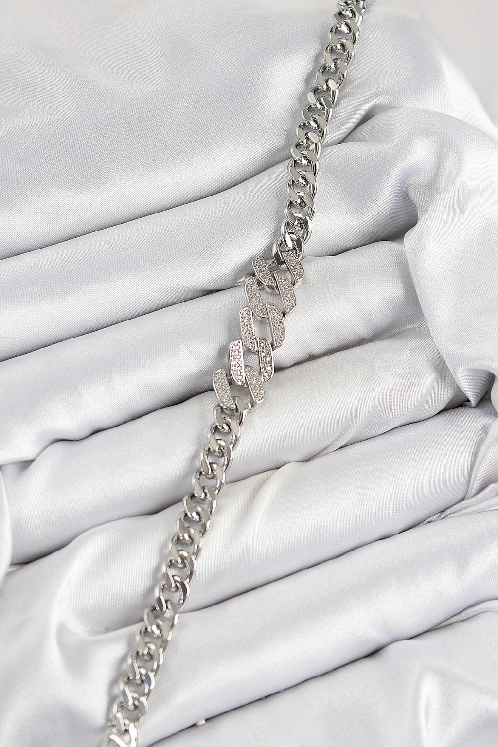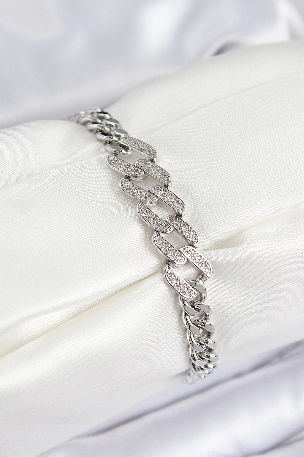 Dodes Dodes Pirinç Zirkon Taşlı Ezme Küba Zincir Model Gümüş Renk Kadın Bileklik TG27BB7550