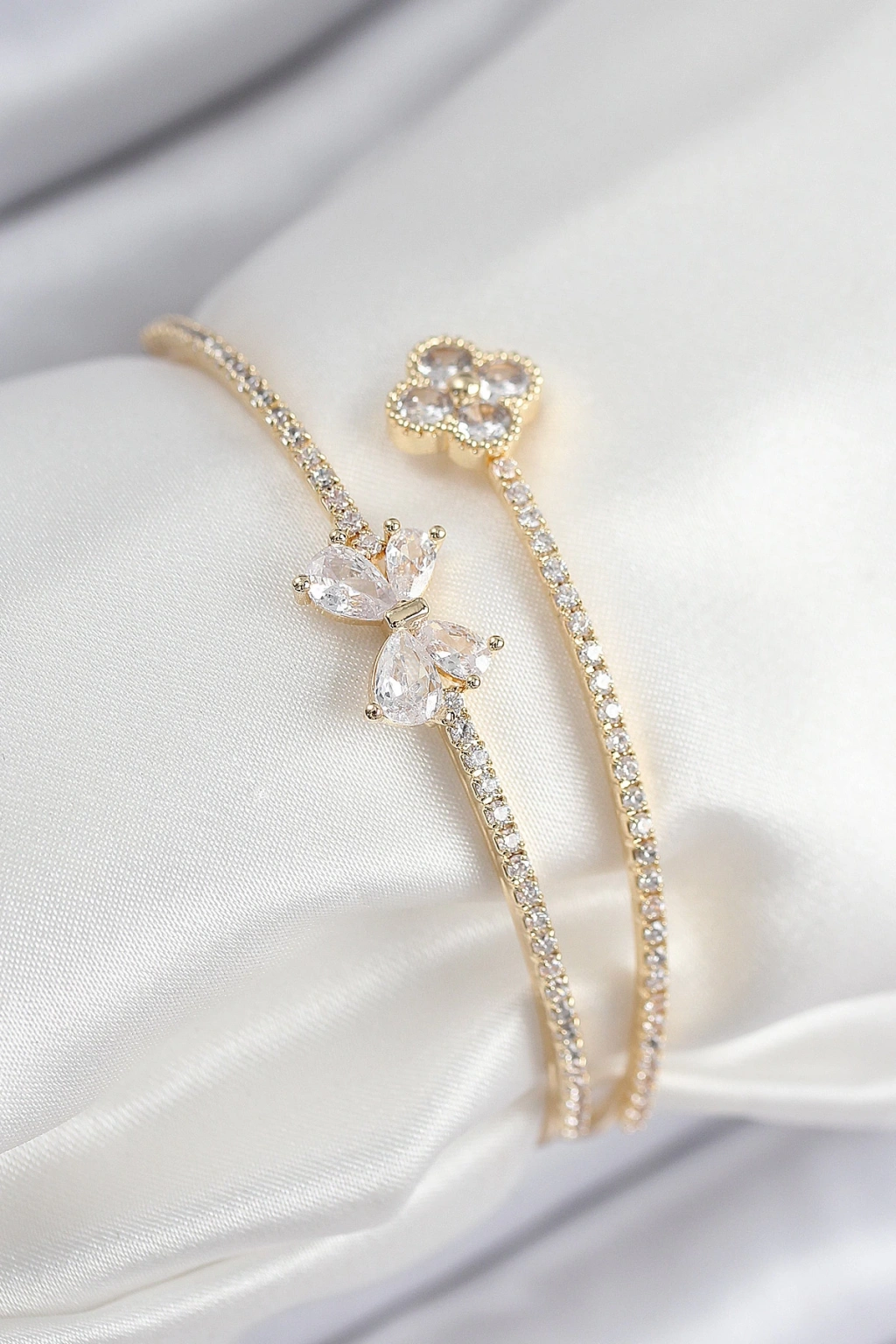 Dodes Dodes Pirinç Zirkon Taşlı Fiyonk Ve Yonca Model Gold Renk Kadın Bileklik TG27BB7851